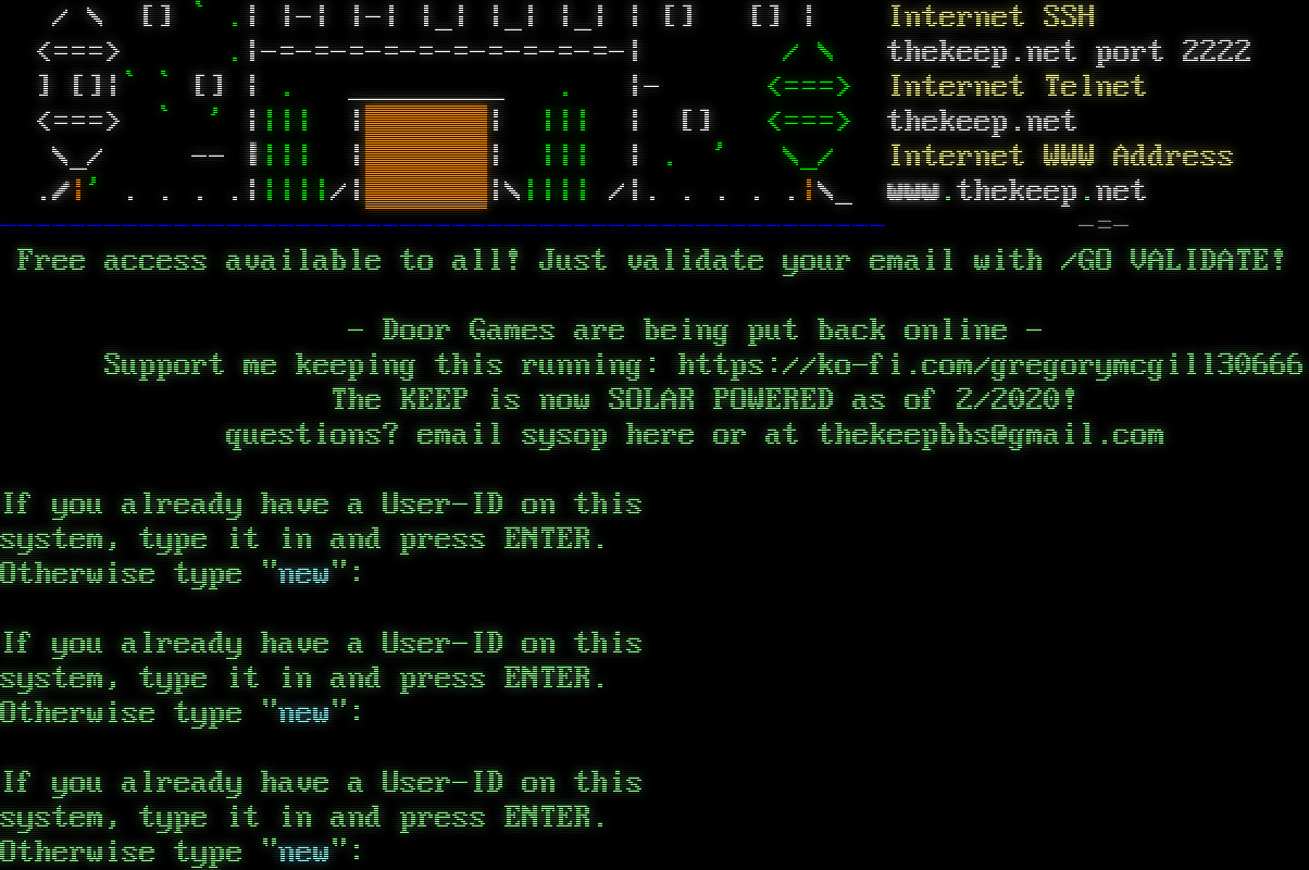 Auto-sensing... ! SGSVR? Please choose one of these languages/protocols: 1 ... English/ANSI The standard English language version 2 ... English/RIP The English version of RIPscrip graphics 3 ... English/40col 40 Column version of the BBS Choose a number from 1 to 3: 1 Display ANSI graphics (Y/N)? y Running WorldGroup Ver 3.2 - Reg number: 25314817 - 32 incoming lines _​----\| _ _ _ _ _ The KEEP BBS & Info Services -​---\|_​----\| ]-I-I-I-[ The Electronic Renaissance _ _ _ _ _ _ _​----\| \| -​---\| \\ \` ' / Line 2 at 38400 Baud. ]-I-I-I-I-[ -​---\| \| \| \|. \` \| -=- \\ \` '_/ \| / \\ \| \| /^\\\| Featuring: [] \`__\| ^ / ^ \\ ^ \| \|\*\|\| On-line Entertainment and \|__ ,\| / \\ / ^ ^\`\\ / \\ \| ===\| friendly fun atmosphere! ___\| ___ ,\|__ / ^ /=​_=_=_=\\ ^ \\ \|, \`_\| -=- I_I__I_I__I_I (=​===(_​________)_​^___\|_​___\|_​___ There are NO ADULT graphic \\-\\--\|-\|--/-/ \| I [ ]__I I_I__\|_​___I_I_\| files on this system. \|[] \` '\|_ \|_ _\|\`__ ._[ _-\\--\|-\|--/-/ -=- / \\ [] \` .\| \|-\| \|-\| \|_\| \|_\| \|_\| \| [] [] \| Internet SSH <===> .\|-​=-=-=-=-=-=-=-=-=-=-\| / \\ thekeep.net port 2222 ] []\|\` \` [] \| . _​________ . \|- <===> Internet Telnet <===> \` ' \|\|\|\| \| \| \|\|\| \| [] <===> thekeep.net \\_/ -- \|\|\|\| \| \| \|\|\| \| . ' \\_/ Internet WWW Address ./\|' . . . .\|\|\|\|\|/\|_​______\|\\\|\|\|\| /\|. . . . .\|\\_ www.thekeep.net -​-------------------------------------------------- -=- Free access available to all! Just validate your email with /GO VALIDATE! - Door Games are being put back online - Support me keeping this running: https://ko-fi.com/gregorymcgill30666 The KEEP is now SOLAR POWERED as of 2/2020! questions? email sysop here or at thekeepbbs@gmail.com If you already have a User-ID on this system, type it in and press ENTER. Otherwise type "new": If you already have a User-ID on this system, type it in and press ENTER. Otherwise type "new": If you already have a User-ID on this system, type it in and press ENTER. Otherwise type "new":