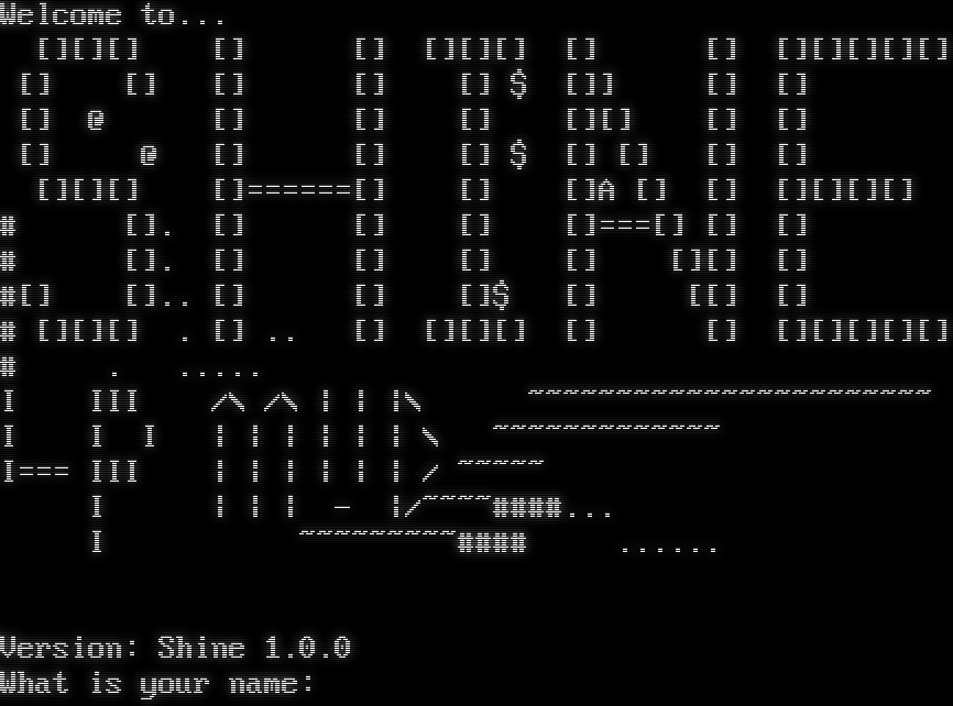 Welcome to... [][][] [] [] [][][] [] [] [][][][][] [] [] [] [] [] $ []] [] [] [] @ [] [] [] [][] [] [] [] @ [] [] [] $ [] [] [] [] [][][] []=​=====[] [] []A [] [] [][][][] # []. [] [] [] []===[] [] [] # []. [] [] [] [] [][] [] #[] [].. [] [] []$ [] [[] [] # [][][] . [] .. [] [][][] [] [] [][][][][] # . .​.... I III /\\ /\\ \| \| \|\\ ~​~~~~~~~~~~~~~~~~~~~~~~ I I I \| \| \| \| \| \| \\ ~​~~~~~~~~~~~~ I=== III \| \| \| \| \| \| / ~​~~~~ I \| \| \| - \|/~​~~~####... I ~​~~~~~~~~#### .​..... Version: Shine 1.0.0 What is your name: