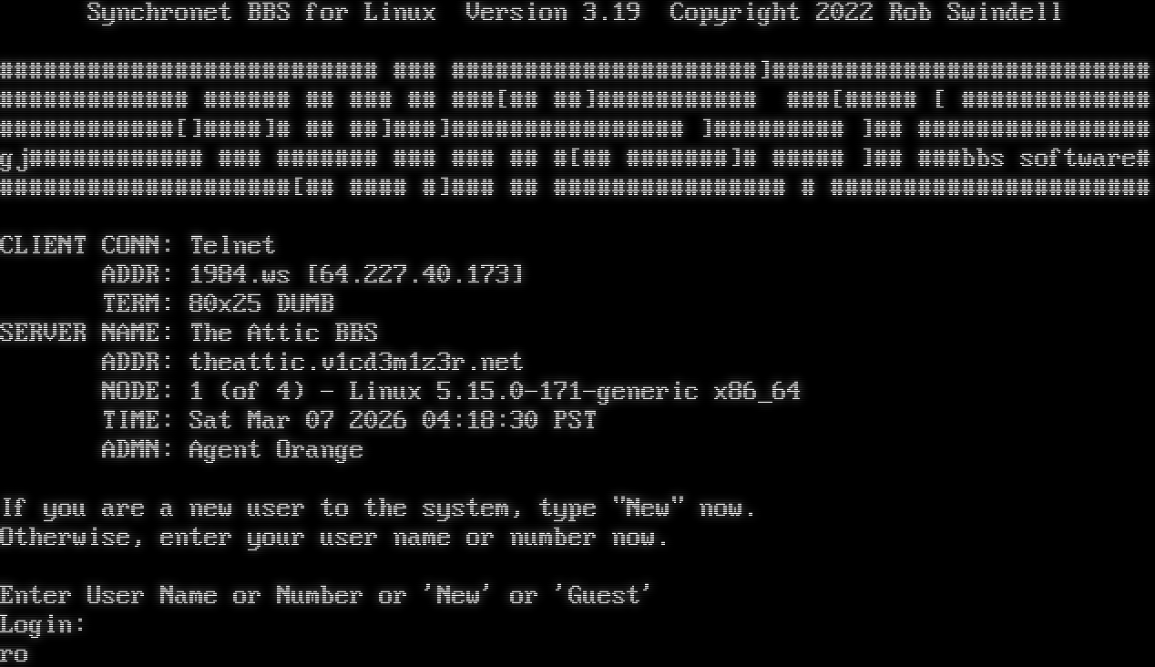 Synchronet BBS for Linux Version 3.19 Telnet connection from: 64.227.40.173 Resolving hostname... _ _ Synchronet BBS for Linux Version 3.19 Copyright 2022 Rob Swindell #​######################### ### #​####################]#​######################### #​############ #​##### ## ### ## ###[## ##]#​########## ###[#​#### [ #​############ #​###########[]#​###]# ## ##]###]#​############### ]#​######## ]## #​############### gj#​########### ### #​###### ### ### ## #[## #​######]# #​#### ]## ###bbs software# #​###################[## #​### #]### ## #​############### # #​##################### CLIENT CONN: Telnet ADDR: 1984.ws [64.227.40.173] TERM: 80x25 DUMB SERVER NAME: The Attic BBS ADDR: theattic.v1cd3m1z3r.net NODE: 1 (of 4) - Linux 5.15.0-171-generic x86_64 TIME: Sat Mar 07 2026 04:18:30 PST ADMN: Agent Orange If you are a new user to the system, type "New" now. Otherwise, enter your user name or number now. Enter User Name or Number or 'New' or 'Guest' Login: ro