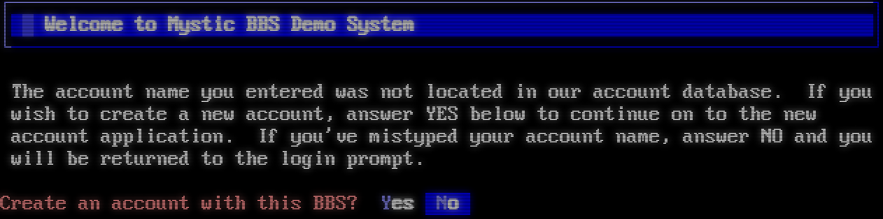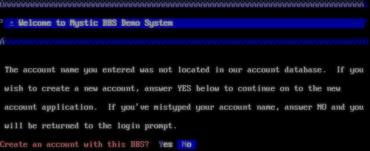 Mystic BBS Version 1.12 A47 Copyright (C) 1997-2021 By James Coyle Detecting terminal emulation: ANSI detected. [0] MS-DOS CP437 [1] UTF-8 Select Terminal Codepage [Enter = CP437]: 1 ██ █ ████████████ █ ██ █ █ █ █ ██ ██ █ ██ █ █ ██ █ █ █ █ █ █ █ █ ████ ███ █ █ ██ █ █ █ █ █ █ Θ ██████ █ ███ ██ ███ █ ██ █ ██ ██ █ █████████ █ ███████ █████████████ ██ █ █ █ █ █ █ █ █ ███ █ █ █ █ █ █ █ █ █ █ █ █████ █ █ █ ██ █ ██ ██████ █ █ ████ █ █ █ █ █ █ █ ████ █ █ █ ██████ Welcome to The Nine Worlds BBS! [■] Enter your user name: ┌─────────────────────────────────────────────────────────────────────────────┐ │ ▒ Welcome to Mystic BBS Demo System │ └─────────────────────────────────────────────────────────────────────────────┘ The account name you entered was not located in our account database. If you wish to create a new account, answer YES below to continue on to the new account application. If you've mistyped your account name, answer NO and you will be returned to the login prompt. Create an account with this BBS? Yes No