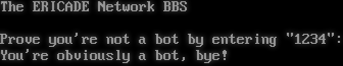 The ERICADE Network BBS Prove you're not a bot by entering "1234": You're obviously a bot, bye!