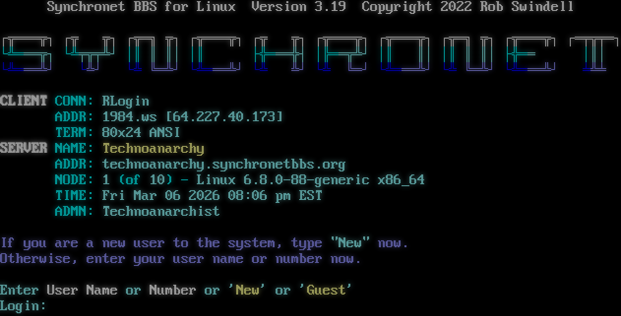 Synchronet BBS for Linux Version 3.19 RLogin connection from: 64.227.40.173 Resolving hostname... _ _ Synchronet BBS for Linux Version 3.19 Copyright 2022 Rob Swindell ┌╦═══╦┐ ┌╦╦┐ ┌╦═╗ ╦┐ ┌╦═══╦┐ ┌╦╦┐ ┌╦═══╦┐ ┌╦═══╦┐ ┌╦═╗ ╦┐ ┌╦═══╦┐ ┌═╤╦╤═┐ └╩═══╦┐ └╩╤╦╤╩┘ │║ ║ ║│ │║├╬═══╬┤ │╠══╦╩┘ │║║│ │║ ║ ║│ ├╬══│║│ └╩═══╩┘└╩┘└╩ ╚═╩┘ └╩═══╩┘ └╩╩┘ └╩ ╚═┘ └╩═══╩┘ └╩ ╚═╩┘ └╩═══╩┘╧╩╧ CLIENT CONN: RLogin ADDR: 1984.ws [64.227.40.173] TERM: 80x24 ANSI SERVER NAME: Technoanarchy ADDR: technoanarchy.synchronetbbs.org NODE: 1 (of 10) - Linux 6.8.0-88-generic x86_64 TIME: Fri Mar 06 2026 08:06 pm EST ADMN: Technoanarchist If you are a new user to the system, type "New" now. Otherwise, enter your user name or number now. Enter User Name or Number or 'New' or 'Guest' Login: