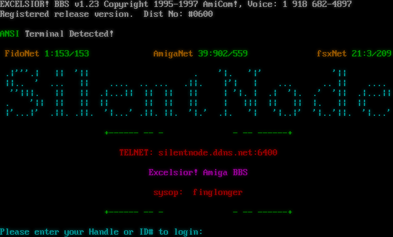 telnetd.device: Waiting for unit to answer. telnetd.device: Connected to TCP/IP port 6400 unit 0.  EXCELSIOR! BBS v1.23 Copyright 1995-1997 AmiCom!, Voice: 1 918 682-4897 Registered release version. Dist No: #0600 ! ANSI Terminal Detected! FidoNet 1:153/153 AmigaNet 39:902/559 fsxNet 21:3/209 .\|'''.\| \|\| '\|\| . '\|. '\|' '\|\| \|\|.. ' ... \|\| .​... .. ... .\|\|. \|'\| \| ... .. \|\| .​... ''\|\|\|. \|\| \|\| .\|...\|\| \|\| \|\| \|\| \| '\|. \| .\| '\|. .' '\|\| .\|...\|\| . '\|\| \|\| \|\| \|\| \|\| \|\| \|\| \| \|\|\| \|\| \|\| \|. \|\| \|\| \|'...\|' .\|\|. .\|\|. '\|...' .\|\|. \|\|. '\|.' .\|. '\| '\|..\|' '\|..'\|\|. '\|...' +​------ -- - - -- -​-----+ TELNET: silentnode.ddns.net:6400 Excelsior! Amiga BBS sysop: finglonger +​------ -- - - -- -​-----+ Please enter your Handle or ID# to login: