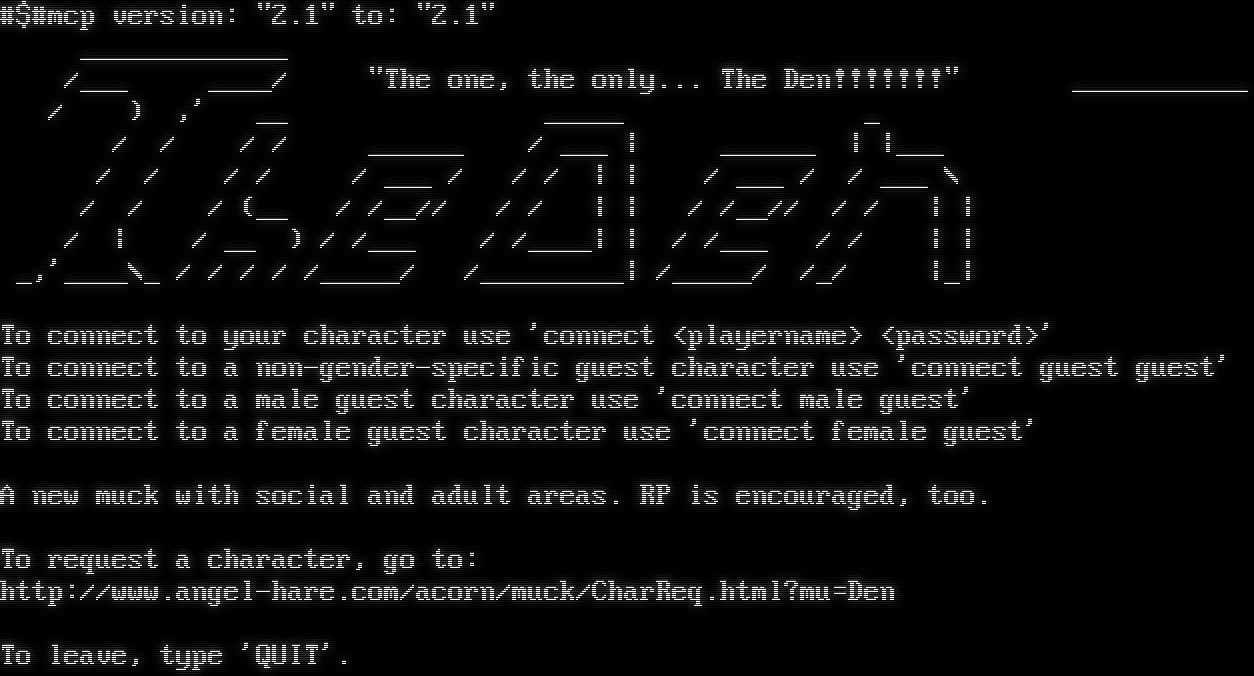 #$#mcp version: "2.1" to: "2.1" _​____________ /___ _​___/ "The one, the only... The Den!!!!!!!" _​__________ / ) ,' __ _​____ _ / / / / _​_____ / ___ \| _​_____ \| \|___ / / / / / ___ / / / \| \| / ___ / / ___ \\ / / / (__ / /__// / / \| \| / /__// / / \| \| / \| / __ ) / /___ / /_​___\| \| / /___ / / \| \| _,'_​___\\_ / / / / /_​____/ /_​________\| /_​____/ /_/ \|_\| To connect to your character use 'connect <playername> <password>' To connect to a non-gender-specific guest character use 'connect guest guest' To connect to a male guest character use 'connect male guest' To connect to a female guest character use 'connect female guest' A new muck with social and adult areas. RP is encouraged, too. To request a character, go to: http://www.angel-hare.com/acorn/muck/CharReq.html?mu=Den To leave, type 'QUIT'.