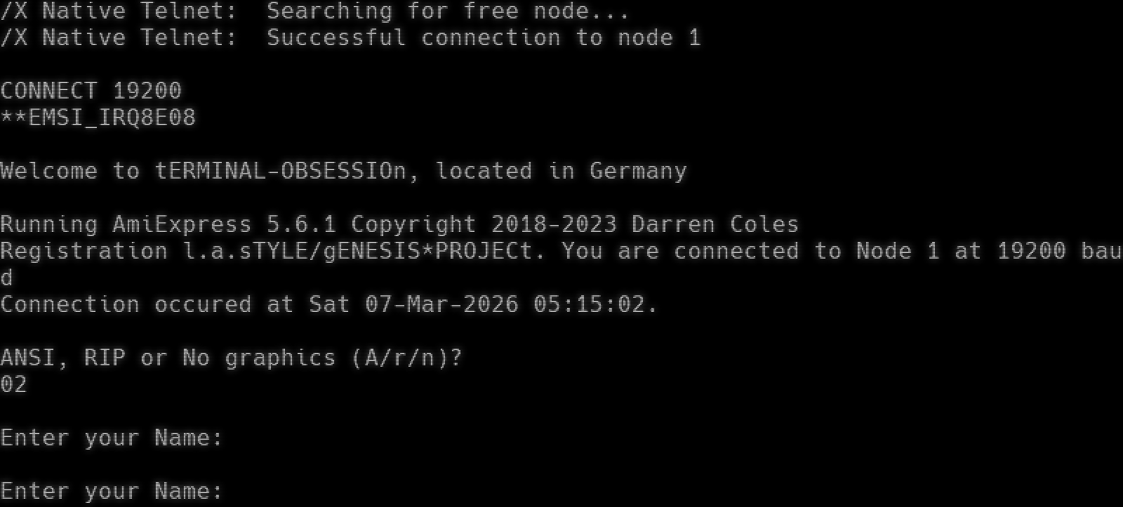 /X Native Telnet: Searching for free node... /X Native Telnet: Successful connection to node 1 CONNECT 19200 \*\*EMSI_IRQ8E08 Welcome to tERMINAL-OBSESSIOn, located in Germany Running AmiExpress 5.6.1 Copyright 2018-2023 Darren Coles Registration l.a.sTYLE/gENESIS\*PROJECt. You are connected to Node 1 at 19200 baud Connection occured at Sat 07-Mar-2026 05:15:02. ANSI, RIP or No graphics (A/r/n)? 02 Enter your Name: Enter your Name: