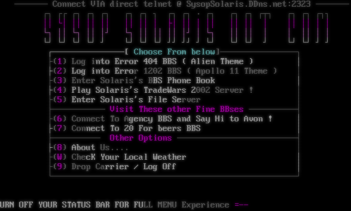 Mystic BBS Version 1.12 A47 Copyright (C) 1997-2021 By James Coyle Detecting terminal emulation: ANSI detected. ───────  Connect VIA direct telnet @ SysopSolaris.DDns.net:2323 ─────── ┌┐ ┌┌ ┌┐ ┌┐ ┌┐ ┌┐ ┌┐ ┐ ┌┐ ┌┐ ∙ ┌┐ ┌┐ ┌┐ ┌┬┐ ┌┐ ┌┐ ┌┐┐ ││ └│ ││ ││ ││ ││ ││ │ ├│ ││ │ ││ ││ ││ │ ││ ││ │ │ └┐ ││ └┐ ││ │┘ └┐ ││ ││ ││ │┘ │ └┐ ││ ││ │ │ ││ │ │ └┘ └┘ └┘ └┘ ┘ └┘ └┘ └┘ ┘┘ ┘┘ ┘ └┘ └┘ └┘ ┘ └┘ └┘ ┘ ┘ Welcome to The Solaris Family of fine BBSes ┌───────────────[ Choose From below]────────────────┐ ├(1) Log into Error 404 BBS ( Alien Theme ) │ ├(2) Log into Error 1202 BBS ( Apollo 11 Theme ) │ ├(3) Enter Solaris's BBS Phone Book │ ├(4) Play Solaris's TradeWars 2002 Server ! │ ├(5) Enter Solaris's File Server │ ├─────────── Visit These other Fine BBses ──────────┤ ├(6) Connect To Agency BBS and Say Hi to Avon ! │ ├(7) Connect To 20 For beers BBS │ ├────────── Other Options ─────────────────────────┤ ├(8) About Us.​... │ ├(W) ChecK Your Local Weather │ ├(9) Drop Carrier / Log Off │ └───────────────────────────────────────────────────┘ -= MAKE SURE TO TURN OFF YOUR STATUS BAR FOR FULL MENU Experience =- = MAKE SURE TO TURN OFF YOUR STATUS BAR FOR FULL MENU Experience =- MAKE SURE TO TURN OFF YOUR STATUS BAR FOR FULL MENU Experience =- MAKE SURE TO TURN OFF YOUR STATUS BAR FOR FULL MENU Experience =- AKE SURE TO TURN OFF YOUR STATUS BAR FOR FULL MENU Experience =- KE SURE TO TURN OFF YOUR STATUS BAR FOR FULL MENU Experience =- E SURE TO TURN OFF YOUR STATUS BAR FOR FULL MENU Experience =- SURE TO TURN OFF YOUR STATUS BAR FOR FULL MENU Experience =- SURE TO TURN OFF YOUR STATUS BAR FOR FULL MENU Experience =- URE TO TURN OFF YOUR STATUS BAR FOR FULL MENU Experience =- RE TO TURN OFF YOUR STATUS BAR FOR FULL MENU Experience =- E TO TURN OFF YOUR STATUS BAR FOR FULL MENU Experience =- TO TURN OFF YOUR STATUS BAR FOR FULL MENU Experience =- TO TURN OFF YOUR STATUS BAR FOR FULL MENU Experience =- O TURN OFF YOUR STATUS BAR FOR FULL MENU Experience =- TURN OFF YOUR STATUS BAR FOR FULL MENU Experience =- TURN OFF YOUR STATUS BAR FOR FULL MENU Experience =- URN OFF YOUR STATUS BAR FOR FULL MENU Experience =- RN OFF YOUR STATUS BAR FOR FULL MENU Experience =- N OFF YOUR STATUS BAR FOR FULL MENU Experience =- OFF YOUR STATUS BAR FOR FULL MENU Experience =- OFF YOUR STATUS BAR FOR FULL MENU Experience =- FF YOUR STATUS BAR FOR FULL MENU Experience =- F YOUR STATUS BAR FOR FULL MENU Experience =- YOUR STATUS BAR FOR FULL MENU Experience =- YOUR STATUS BAR FOR FULL MENU Experience =- OUR STATUS BAR FOR FULL MENU Experience =- UR STATUS BAR FOR FULL MENU Experience =- R STATUS BAR FOR FULL MENU Experience =- STATUS BAR FOR FULL MENU Experience =- STATUS BAR FOR FULL MENU Experience =- TATUS BAR FOR FULL MENU Experience =- ATUS BAR FOR FULL MENU Experience =- TUS BAR FOR FULL MENU Experience =- US BAR FOR FULL MENU Experience =- S BAR FOR FULL MENU Experience =- BAR FOR FULL MENU Experience =- BAR FOR FULL MENU Experience =- AR FOR FULL MENU Experience =- -R FOR FULL MENU Experience =- -= FOR FULL MENU Experience =- -= FOR FULL MENU Experience =- -= MOR FULL MENU Experience =- -= MAR FULL MENU Experience =- -= MAK FULL MENU Experience =- -= MAKEFULL MENU Experience =- -= MAKE ULL MENU Experience =- -= MAKE SLL MENU Experience =- -= MAKE SUL MENU Experience =- -= MAKE SUR MENU Experience =- -= MAKE SUREMENU Experience =- -= MAKE SURE ENU Experience =- -= MAKE SURE TNU Experience =- -= MAKE SURE TOU Experience =- -= MAKE SURE TO Experience =- -= MAKE SURE TO TExperience =- -= MAKE SURE TO TUxperience =- -= MAKE SURE TO TURperience =- -= MAKE SURE TO TURNerience =- -= MAKE SURE TO TURN rience =- -= MAKE SURE TO TURN Oience =- -= MAKE SURE TO TURN OFence =- -= MAKE SURE TO TURN OFFnce =- -= MAKE SURE TO TURN OFF ce =- -= MAKE SURE TO TURN OFF Ye =- -= MAKE SURE TO TURN OFF YO =- -= MAKE SURE TO TURN OFF YOU=- -= MAKE SURE TO TURN OFF YOUR ───────  Connect VIA direct telnet @ SysopSolaris.DDns.net:2323 ─────── ┌┐ ┌┌ ┌┐ ┌┐ ┌┐ ┌┐ ┌┐ ┐ ┌┐ ┌┐ ∙ ┌┐ ┌┐ ┌┐ ┌┬┐ ┌┐ ┌┐ ┌┐┐ ││ └│ ││ ││ ││ ││ ││ │ ├│ ││ │ ││ ││ ││ │ ││ ││ │ │ └┐ ││ └┐ ││ │┘ └┐ ││ ││ ││ │┘ │ └┐ ││ ││ │ │ ││ │ │ └┘ └┘ └┘ └┘ ┘ └┘ └┘ └┘ ┘┘ ┘┘ ┘ └┘ └┘ └┘ ┘ └┘ └┘ ┘ ┘ Welcome to The Solaris Family of fine BBSes ┌───────────────[ Choose From below]────────────────┐ ├(1) Log into Error 404 BBS ( Alien Theme ) │ ├(2) Log into Error 1202 BBS ( Apollo 11 Theme ) │ ├(3) Enter Solaris's BBS Phone Book │ ├(4) Play Solaris's TradeWars 2002 Server ! │ ├(5) Enter Solaris's File Server │ ├─────────── Visit These other Fine BBses ──────────┤ ├(6) Connect To Agency BBS and Say Hi to Avon ! │ ├(7) Connect To 20 For beers BBS │ ├────────── Other Options ─────────────────────────┤ ├(8) About Us.​... │ ├(W) ChecK Your Local Weather │ ├(9) Drop Carrier / Log Off │ └──────────────────────────────