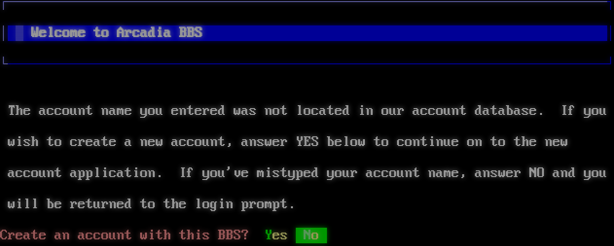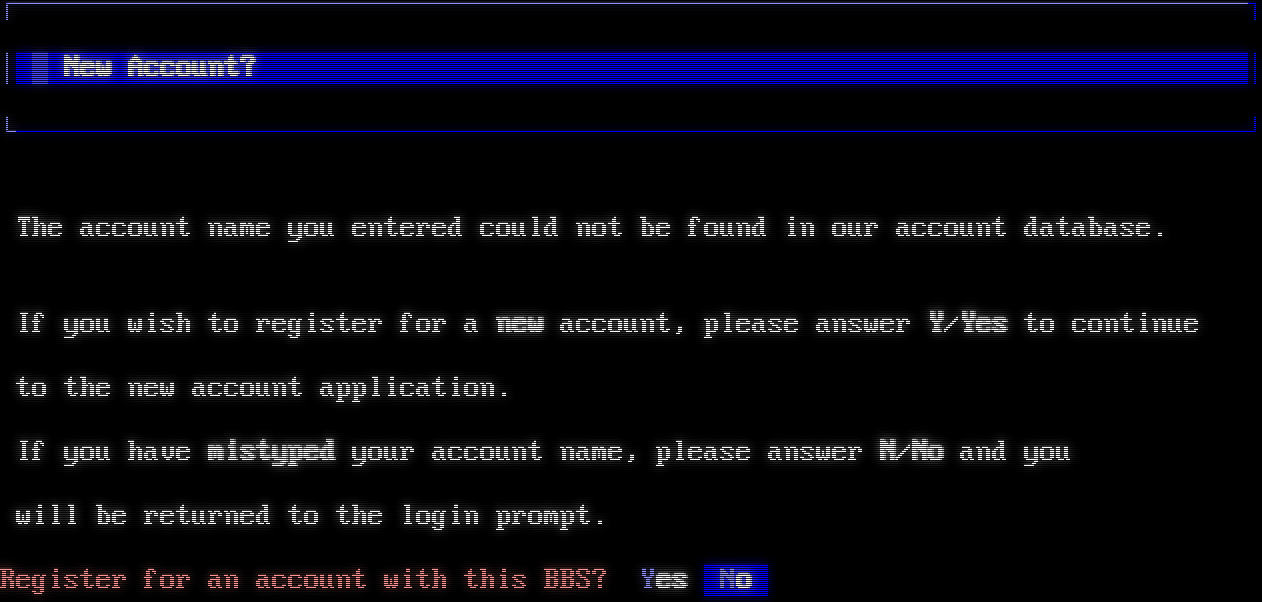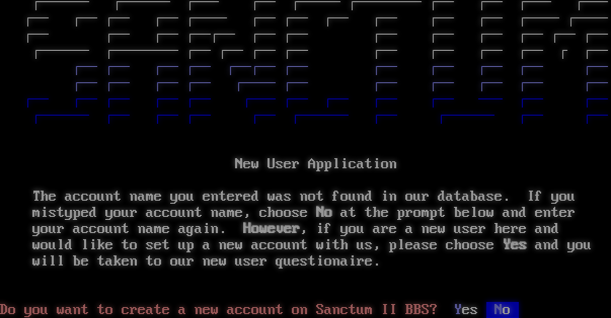 Mystic BBS v1.10 for Windows Node 1 Copyright (C) 1997-2015 By James Coyle Detecting terminal emulation: ANSI detected. ┌────── ┌────── ┌─── ┌── ┌───── ┌──────── ┌── ┌── ┌─── ┌─── ┌── ┌── ┌── ┌── ┌──── ┌── ┌── ┌── ┌── ┌── ┌── ┌──── ┌──── ┌── ┌── ┌── ┌──┌── ┌── ┌── ┌── ┌── ┌── ┌── ┌── ┌── ┌────── ┌──────── ┌── ┌── ┌── ┌──┌── ┌── ┌── ┌── ┌ ┌── ┌── ┌── ┌── ┌── ┌──┌── ┌── ┌── ┌── ┌── ┌──┌── ┌── ┌── ┌── ┌── ┌──── ┌── ┌── ┌── ┌── ┌──┌── ┌── ┌── ┌── ┌── ┌── ┌─── ┌── ┌── ┌── ┌── ─── ┌──┌── ┌────── ┌── ┌── ┌──┌── ┌────── ┌── ┌────── ┌──┌── Online since 1982 ┌───── ┌───── DoorMUD Professional Hardware History ┌─── ┌─── ArrowBridge II Apple ][+ 1 Mhz ┌─── ┌─── Mines of Gorr 386SX 66 Mhz┌─── ┌─── Galactic Overlord Celeron 400 Mhz ┌─── ┌─── Solar Realms Elite Pentium III 750 Mhz ┌─── ┌─── Tradewars 2002 Athlon 1 Ghz ┌─── ┌─── Mystic BBS Quad Xeon 3.6 Ghz┌───── ┌───── L.O.R.E ~ CR[■] Enter your user name or 'new': ┌────── ┌────── ┌─── ┌── ┌───── ┌──────── ┌── ┌── ┌─── ┌─── ┌── ┌── ┌── ┌── ┌──── ┌── ┌── ┌── ┌── ┌── ┌── ┌──── ┌──── ┌── ┌── ┌── ┌──┌── ┌── ┌── ┌── ┌── ┌── ┌── ┌── ┌── ┌────── ┌──────── ┌── ┌── ┌── ┌──┌── ┌── ┌── ┌── ┌ ┌── ┌── ┌── ┌── ┌── ┌──┌── ┌── ┌── ┌── ┌── ┌──┌── ┌── ┌── ┌── ┌── ┌──── ┌── ┌── ┌── ┌── ┌──┌── ┌── ┌── ┌── ┌── ┌── ┌─── ┌── ┌── ┌── ┌── ─── ┌──┌── ┌────── ┌── ┌── ┌──┌── ┌────── ┌── ┌────── ┌──┌── New User Application The account name you entered was not found in our database. If you mistyped your account name, choose No at the prompt below and enter your account name again. However, if you are a new user here and would like to set up a new account with us, please choose Yes and you will be taken to our new user questionaire. ~ Do you want to create a new account on Sanctum II BBS? Yes No