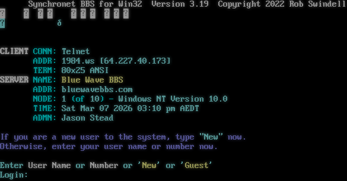Synchronet BBS for Win32 Version 3.19 Telnet connection from: 64.227.40.173 Resolving hostname... _ _ Synchronet BBS for Win32 Version 3.19 Copyright 2022 Rob Swindell ˿ ˿ ˿ ˿ ˿ ˿ ˿ ˿ ˿ Ϳ ˿ δ CLIENT CONN: Telnet ADDR: 1984.ws [64.227.40.173] TERM: 80x25 ANSI SERVER NAME: Blue Wave BBS ADDR: bluewavebbs.com NODE: 1 (of 10) - Windows NT Version 10.0 TIME: Sat Mar 07 2026 03:10 pm AEDT ADMN: Jason Stead If you are a new user to the system, type "New" now. Otherwise, enter your user name or number now. Enter User Name or Number or 'New' or 'Guest' Login: