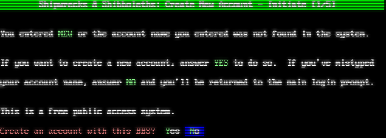 Mystic BBS Version 1.12 A48 Copyright (C) 1997-2023 By James Coyle Detecting terminal emulation: ANSI detected. █▀█░█▀██▀▀░░▀▀█░▀███░███▌█████▌████░░████▀▀██░████████▌█████████████████░█░█░███▀▀▀████░▌▀████▀▀▒▀▀█▌███▌██████▌████░██████▀▀███▀█████░██████████████████▀█▓█░█▌███▀ ████████░██████░░░░░░░▀██▒███████████████████▓▓█░█▀▀▀█ Shipwrecks & Shibboleths █████████░████░░██░██▀█▀░▀████████████████████▀███░▀██ ░███████████████░█▀▀████▀▀▀░███████████████████▌████░░▀▓▀░▀░░█▒██▒░░██░████░█▌▌█░██▀███████████████▀▀█▀▀███░▒▀████████████████████▀░░██░░█░█▒▒███░███░████░██████░█▀█▀█████████████████▀▀█▀▀█░░████████████████████▀░███▀██░█▀░░█▒█ ███████▀░█████░██▀░░█ Culprit...The Dust Council <dustcouncil@frostwarning.com> ████▀▀███░███░██░▀█▀█ Telnet.​...shibboleths.org:800 ████░▀█████▀██▀██▒░░▀ SSH.​......shibboleths.org:801 ███████░█████░▀▒░███░ WWW.​......http://shibboleths.org ████▀▀▀▀░░█████░█░███ ████▀█░▀██▒██████░██▀███▀███▀▒▀█▀██▀██▀███░▀▀▒▀░█▀▒▀███████████████░█▀████░▀░██▀▀█████░▀▀░█▒██▀░█░█░██▀████▀███▀░██░██▀▀█▀▀█▀░▀█▀░███▀████████████████▀▒░█░▒█████████▀██░█░░▒██░██░█▒░██▀████▀░██ ██▒█▀░░░█░█░██▀░██▀░░░██░░▀▀██▀ r0d3nts, m0es, gobshites, and moonbats welcome! ▀███▀▀█░░█▀░░░██▒████░███░██▀░█ ██████████▀▒▒░█░█▀██████░███▀██▀▀██▀▒▀░▌▒█░▀██▀▀██▀▀██▀█████░▀██▒█████▓▒██████░█████████░▒▒▌░░▀▀█░▒███▀▀▀██▀▀██▀▀██▀██▀█░█░█▀▀░███▀▀██▀░▀█████▀██▒██████░░████░▒▀█ [Login Name]: Shipwrecks & Shibboleths: Create New Account - Initiate [1/5] You entered NEW or the account name you entered was not found in the system. If you want to create a new account, answer YES to do so. If you've mistyped your account name, answer NO and you'll be returned to the main login prompt. This is a free public access system. Create an account with this BBS? Yes No