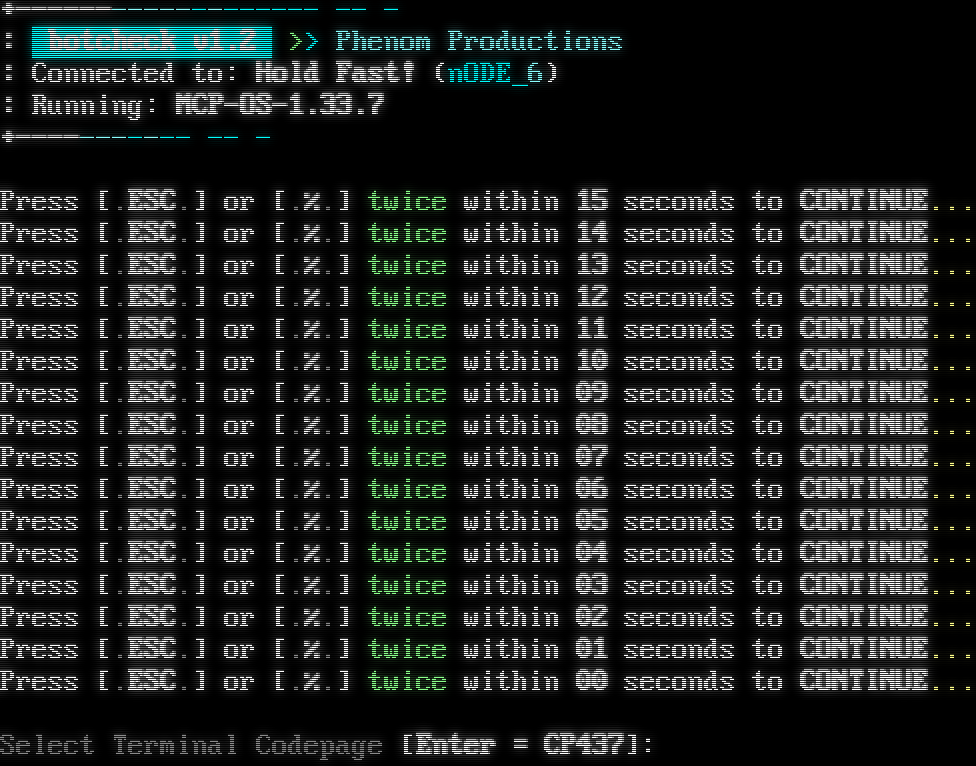 Mystic BBS Version 1.12 A48 Copyright (C) 1997-2023 By James Coyle Detecting terminal emulation: +​------------------- -- - : botcheck v1.2 >> Phenom Productions : Connected to: Hold Fast! (nODE_6) : Running: MCP-OS-1.33.7 +​----------- -- - Press [.ESC.] or [.%.] twice within 15 seconds to CONTINUE...Press [.ESC.] or [.%.] twice within 14 seconds to CONTINUE...Press [.ESC.] or [.%.] twice within 13 seconds to CONTINUE...Press [.ESC.] or [.%.] twice within 12 seconds to CONTINUE...Press [.ESC.] or [.%.] twice within 11 seconds to CONTINUE...Press [.ESC.] or [.%.] twice within 10 seconds to CONTINUE...Press [.ESC.] or [.%.] twice within 09 seconds to CONTINUE...Press [.ESC.] or [.%.] twice within 08 seconds to CONTINUE...Press [.ESC.] or [.%.] twice within 07 seconds to CONTINUE...Press [.ESC.] or [.%.] twice within 06 seconds to CONTINUE...Press [.ESC.] or [.%.] twice within 05 seconds to CONTINUE...Press [.ESC.] or [.%.] twice within 04 seconds to CONTINUE...Press [.ESC.] or [.%.] twice within 03 seconds to CONTINUE...Press [.ESC.] or [.%.] twice within 02 seconds to CONTINUE...Press [.ESC.] or [.%.] twice within 01 seconds to CONTINUE...Press [.ESC.] or [.%.] twice within 00 seconds to CONTINUE... [0] MS-DOS CP437 [1] UTF-8 Select Terminal Codepage [Enter = CP437]: