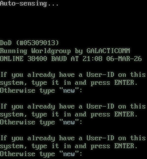 Auto-sensing...  !  WELCOME! DoD (#05309013) Running Worldgroup by GALACTICOMM ONLINE 38400 BAUD AT 21:08 06-MAR-26 If you already have a User-ID on this system, type it in and press ENTER. Otherwise type "new": If you already have a User-ID on this system, type it in and press ENTER. Otherwise type "new": If you already have a User-ID on this system, type it in and press ENTER. Otherwise type "new":