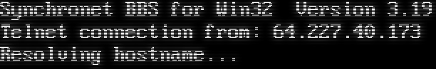 Synchronet BBS for Win32 Version 3.19 Telnet connection from: 64.227.40.173 Resolving hostname...