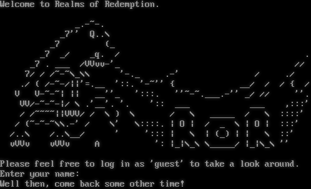 Welcome to Realms of Redemption. _​.-~-. _7'' Q..\\ _7 (_ _7 _/ _q. / . _7 . ___ /VVvv-'_ // 7/ / /~-~\\_\\\\ '-._ .-' / ./ ./ ( /-~-/\|\|'=​.__ '::. '-~'' { __/ / / { / V V-​~-~\| \|\| __''_ ':::. ''~​-~.___.-'' _/ // ''. VV/-​~-~-\|/ \\ .'__'. '. ':: ___ ___ ,:::' / /~​~~~\|\|VVV/ / \\ ) \\ / \\ _​____ / \\ ::::' / (~​-~-~\\\\.-' / \\' \\::::. \| O \| / _ \\ \| O \| :::' /..\\ /..\\__/ ' '::: \| \\ \| (_) \| \| \\ ::' vVVv vVVv A ': \|_\|\\_\\ \\_​____/ \|_\|\\_\\ '' Please feel free to log in as 'guest' to take a look around. Enter your name: Well then, come back some other time!