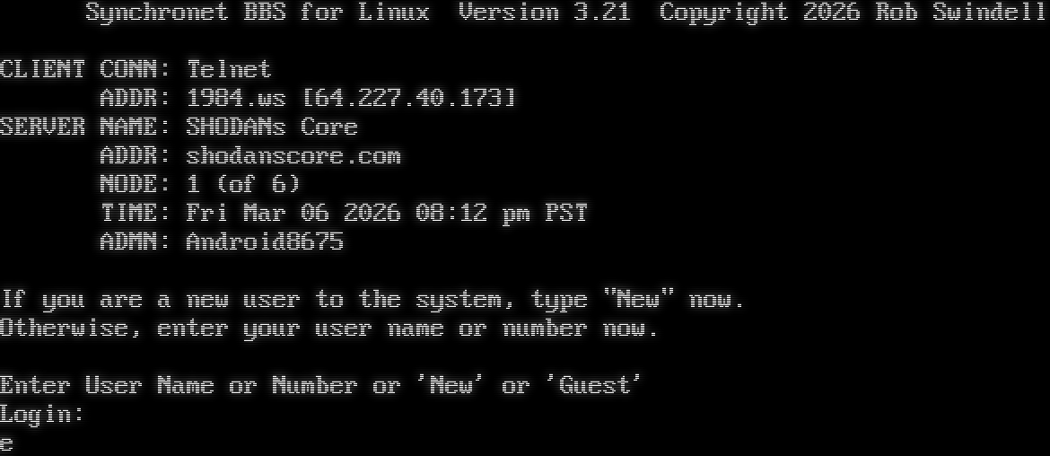 Synchronet BBS for Linux Version 3.21 Telnet connection from: 64.227.40.173 Resolving hostname... Resolving identity... _  Synchronet BBS for Linux Version 3.21 Copyright 2026 Rob Swindell CLIENT CONN: Telnet ADDR: 1984.ws [64.227.40.173] SERVER NAME: SHODANs Core ADDR: shodanscore.com NODE: 1 (of 6) TIME: Fri Mar 06 2026 08:12 pm PST ADMN: Android8675 If you are a new user to the system, type "New" now. Otherwise, enter your user name or number now. Enter User Name or Number or 'New' or 'Guest' Login: Bee