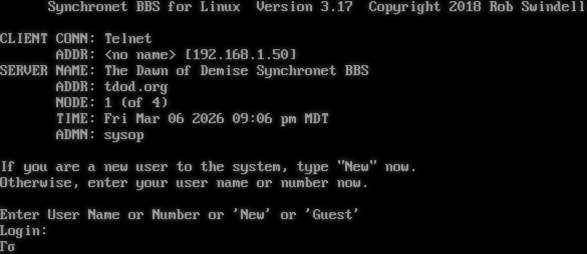 Synchronet BBS for Linux Version 3.17 Telnet connection from: 192.168.1.50 Resolving hostname... __ Synchronet BBS for Linux Version 3.17 Copyright 2018 Rob Swindell CLIENT >>>>CONN: Telnet >>>>ADDR: <no name> [192.168.1.50] SERVER >>>>NAME: The Dawn of Demise Synchronet BBS >>>>ADDR: tdod.org >>>>NODE: 1 (of 4) >>>>TIME: Fri Mar 06 2026 09:06 pm MDT >>>>ADMN: sysop If you are a new user to the system, type "New" now. Otherwise, enter your user name or number now. Enter User Name or Number or 'New' or 'Guest' NN:Login: Γσ
