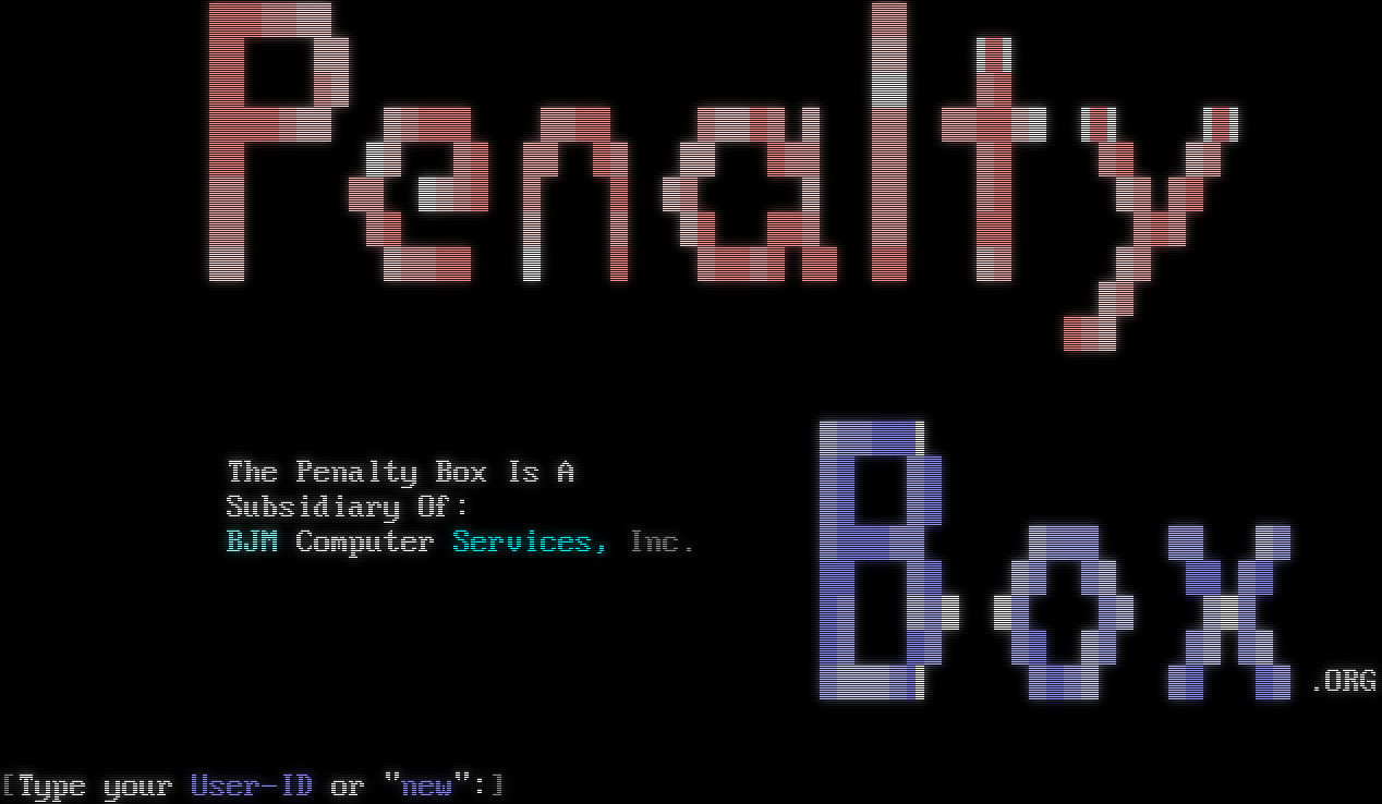 ██▓▒▒░░░ ▓▒ ▓█ ▒▓ ▓█ ▒▓ ▄▄ ▒▓███ ▓█ ▓█▄█████ ▒▓ ▓█ Online Since: ▒▓ ▒▓ ▓█ ▓▓ ░▒▓█ March 4, 1993 [02215079] ▒▓ ▓█ ██ ▓█ Running The Major BBS ░▒ ▒▓ ▓█ ▒▓▓██ ███▓▓▒▒ ▓▓ ██ ▒▒ ▒▒ ▐▌ ██ ▓▒ ░░ ▓█ ████▓▒▒ ▒▓███ ▓▓██ ▓▒▒█▓ ▒ ▓▓ ▓▓██▒░ ▐▌ ▐▌ ██ ░▒ ▓█ ▓▓ █▓ ▒▒ █▓▓ ▓▓ ▓█ ▓█ ▒▓ ▓▓ ▓▓ ░▒▓█ ▓ █ ▒▓ ▒ ▓▓ ▓█ ▒▓ ▓█ ▓▓ ▓█ ▒ ▓ ▒█ ██▓ ▓▓ ██ ▓█▓ ▒▒ ▒▓▓██ ░ █ ▓██▓█ ██ ██ ▒▓ ▒▓ ▒▓ █▓▒ ! ▒▓▓██▌ The Penalty Box Is A ▓█ ▓█ Subsidiary Of: ▓█ ▓█ BJM Computer Services, Inc. ▓███▓▓ ▒▓▓▓ ▓▓ ▒▓ ██ ▓█ ▒▓ ▓▒ ██ ▓█ █▓ ▒▓░ ░▓ ▓▒ ▒░▓ █▓ █▓ ▓█ ▒▓ ▓▒ ▓▒ ▓▒▒▒▓▌ ▓█▓▒ ▓█ █▓ .ORG [Type your User-ID or "new":]