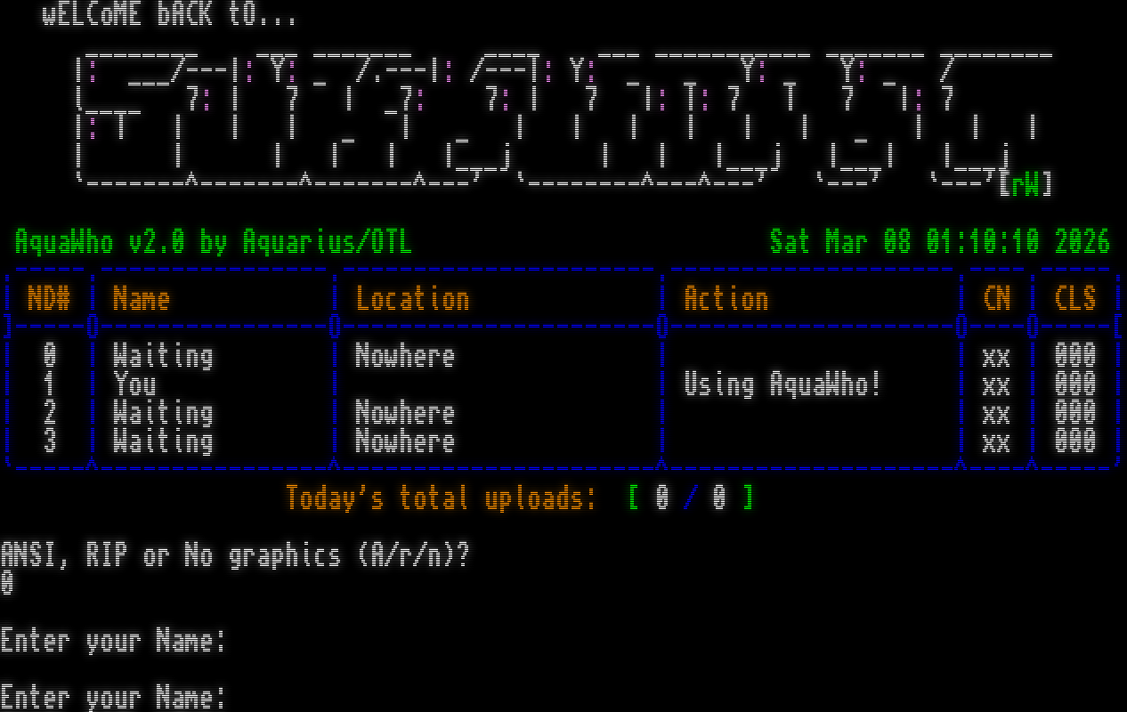 /X Native Telnet: Searching for free node... /X Native Telnet: Successful connection to node 1 CONNECT 19200 \*\*EMSI_IRQ8E08 Welcome to sUBhUMAN, located in tHE wASTeLANDS Running AmiExpress 5.6.0 Copyright 2018-2023 Darren Coles Registration gUYBRuSH^uLT. You are connected to Node 1 at 19200 baud Connection occured at Sat 07-Mar-2026 01:10:10. wELCoME bACK tO... _​_______ ___ _​______ _​___ ___ _​__________ _​______ _​_______ \|: ___/---\|: Y: _ /.​---\|: /---\|: Y: _ _ Y: _ Y: _ / l_​___ 7: \| 7 \| _7: 7: \| 7 \|: \|: 7 \| 7 \|: 7 \|: \| \| \| \| _ \| _ \| \| \| \| \| \| _ \| \| \| \| \| \| \| \| \|___j \| \| \|___j \|___\| \|___j \`-​------^-------^-------^---' \`-​-------^---^---' \`---' \`---'[rW] AquaWho v2.0 by Aquarius/OTL Sat Mar 08 01:10:10 2026 .​-----.----------------.----------------------.--------------------.----.-----. \| ND# \| Name \| Location \| Action \| CN \| CLS \| ]-​----O-​---------------O-​---------------------O-​-------------------O-​---O-​----[ \| 0 \| Waiting \| Nowhere \| \| xx \| 000 \| \| 1 \| You \| \| Using AquaWho! \| xx \| 000 \| \| 2 \| Waiting \| Nowhere \| \| xx \| 000 \| \| 3 \| Waiting \| Nowhere \| \| xx \| 000 \| \`-​----^----------------^----------------------^--------------------^----^-----' Today's total uploads: [ 0 / 0 ] ANSI, RIP or No graphics (A/r/n)? 0 Enter your Name: Enter your Name: