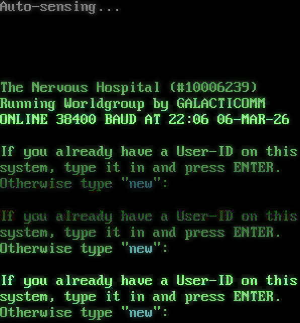 Auto-sensing...  ! WELCOME! The Nervous Hospital (#10006239) Running Worldgroup by GALACTICOMM ONLINE 38400 BAUD AT 22:06 06-MAR-26 If you already have a User-ID on this system, type it in and press ENTER. Otherwise type "new": If you already have a User-ID on this system, type it in and press ENTER. Otherwise type "new": If you already have a User-ID on this system, type it in and press ENTER. Otherwise type "new":