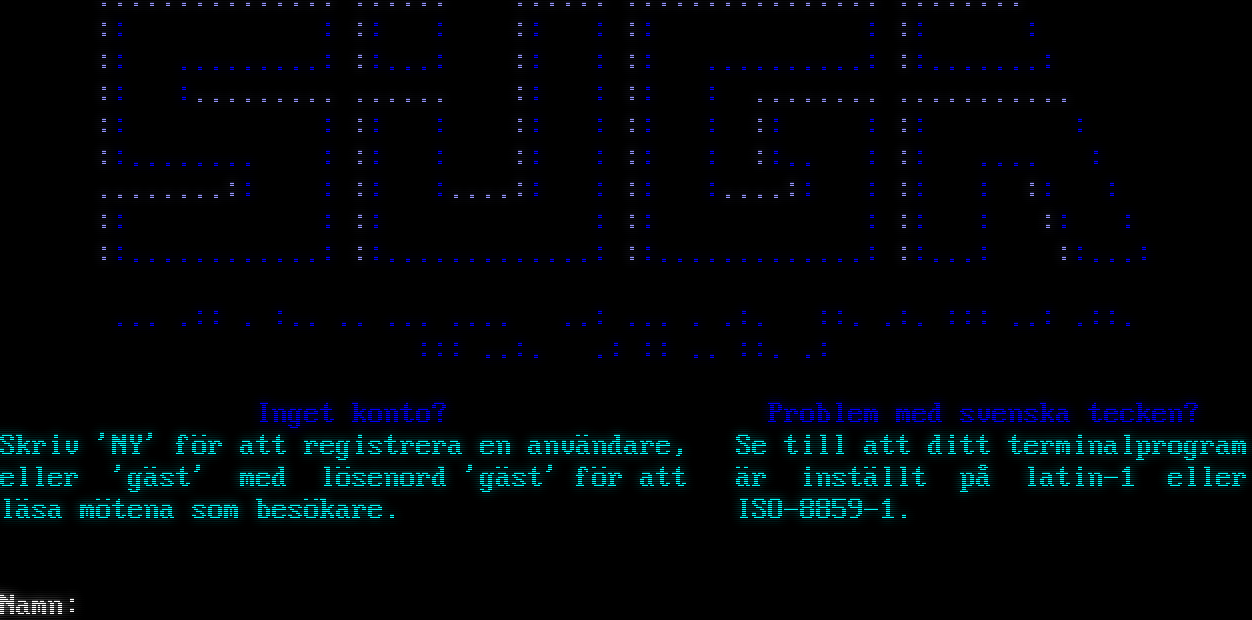 telnetd.device: Waiting for unit to answer. telnetd.device: Connected to TCP/IP port 42512 unit 0.  ATA .​.............. .​..... .​..... .​............... .​....... :: : :: : :: : :: : :: : :: .​........: ::...: :: : :: .​.........: ::.​......: :: :.​........ .​..... :: : :: : .​....... .​.......... :: : :: : :: : :: : :: : :: : ::.​....... : :: : :: : :: : ::.. : :: .​... : .​.......:: : :: :.​...:: : :: :.​...:: : :: : :: : :: : :: : :: : :: : :: : ::.​...........: ::.​............: ::.​............: ::...: ::...: ... .:: . :.. .. ... .​... ..: ... . .:. ::. .:. ::: ..: .::. ::: ..:. .: :: .. ::. .: Inget konto?Problem med svenska tecken? Skriv 'NY' för att registrera en användare, Se till att ditt terminalprogram eller 'gäst' med lösenord 'gäst' för att är inställt på latin-1 eller läsa mötena som besökare.ISO-8859-1. Namn: