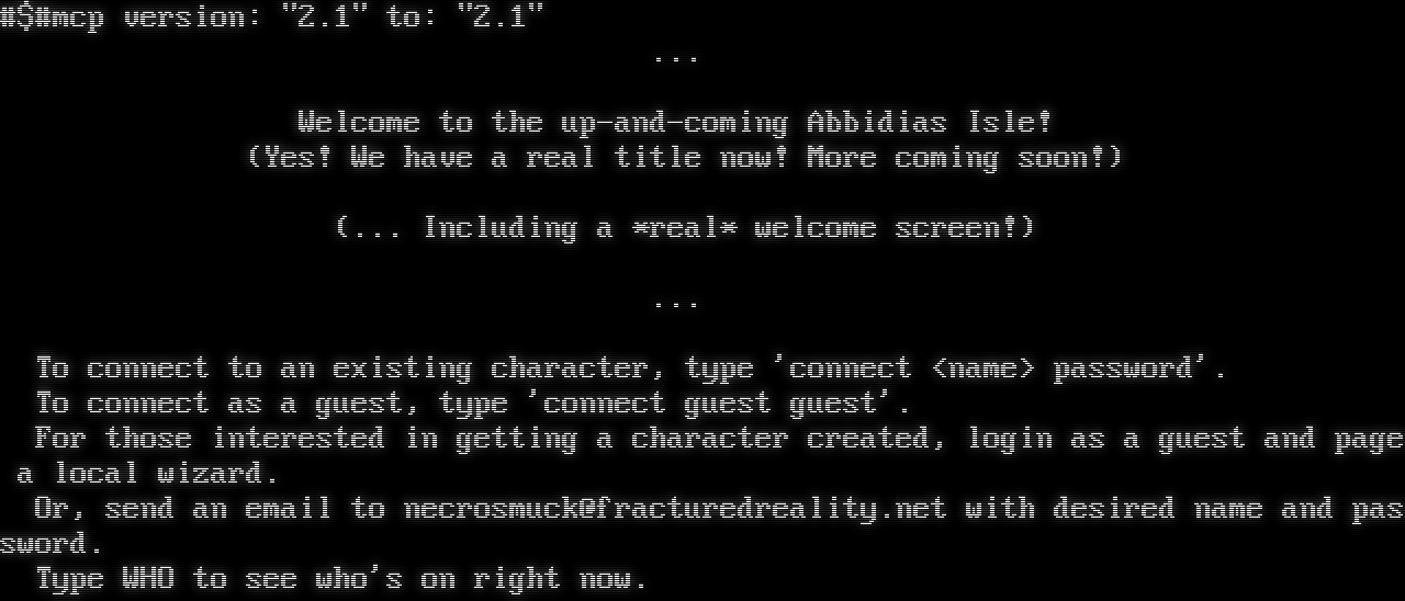 #$#mcp version: "2.1" to: "2.1" ... Welcome to the up-and-coming Abbidias Isle! (Yes! We have a real title now! More coming soon!) (... Including a \*real\* welcome screen!) ... To connect to an existing character, type 'connect <name> password'. To connect as a guest, type 'connect guest guest'. For those interested in getting a character created, login as a guest and page a local wizard. Or, send an email to necrosmuck@fracturedreality.net with desired name and password. Type WHO to see who's on right now.