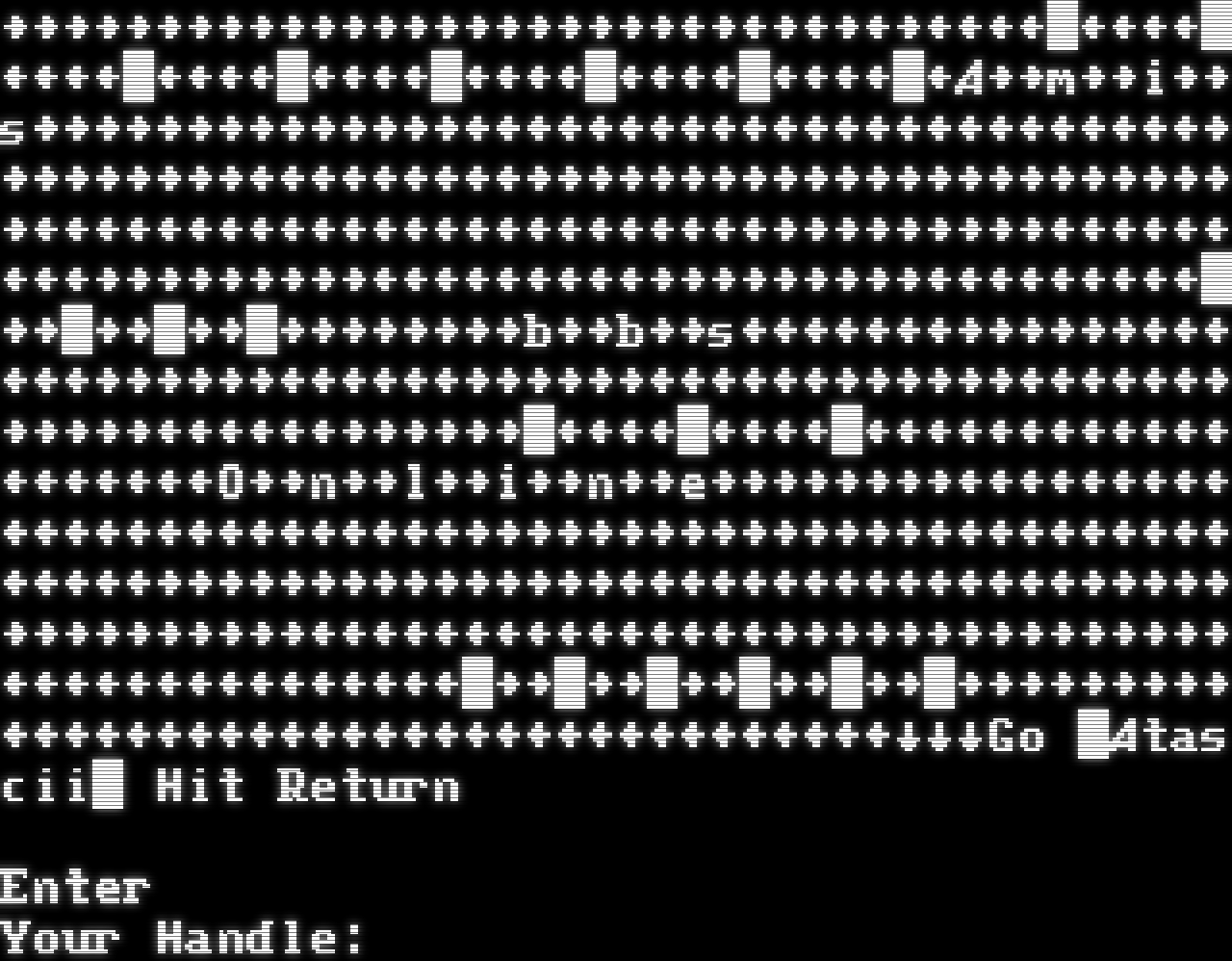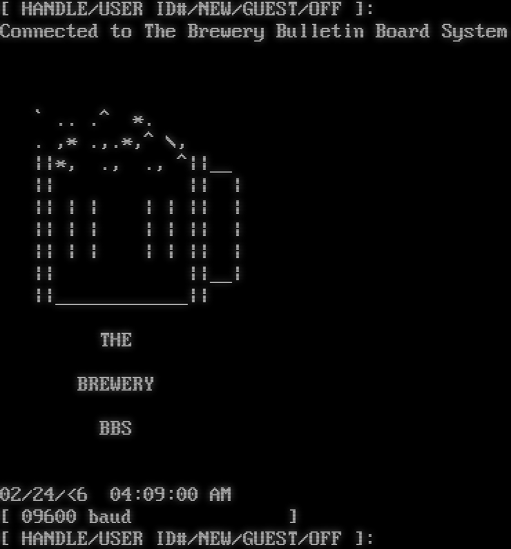 ATA 02/24/<6 04:08:00 AM 09600 Connected to The Brewery Bulletin Board System \` .. .^ \*. . ,\* .,.\*,^ \\, \|\|\*, ., ., ^\|\|__ \|\| \|\| \| \|\| \| \| \| \| \|\| \| \|\| \| \| \| \| \|\| \| \|\| \| \| \| \| \|\| \| \|\| \|\|__\| \|\|_​___________\|\| THE BREWERY BBS 02/24/<6 04:08:00 AM [ 09600 baud ] [ HANDLE/USER ID#/NEW/GUEST/OFF ]: Connected to The Brewery Bulletin Board System \` .. .^ \*. . ,\* .,.\*,^ \\, \|\|\*, ., ., ^\|\|__ \|\| \|\| \| \|\| \| \| \| \| \|\| \| \|\| \| \| \| \| \|\| \| \|\| \| \| \| \| \|\| \| \|\| \|\|__\| \|\|_​___________\|\| THE BREWERY BBS 02/24/<6 04:09:00 AM [ 09600 baud ] [ HANDLE/USER ID#/NEW/GUEST/OFF ]: