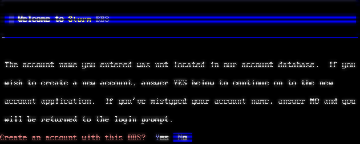 Mystic BBS Version 1.12 A48 Copyright (C) 1997-2023 By James Coyle Detecting terminal emulation: ANSI detected. ░░░░░░░░█░░░░░░░░░░░░░░░░░░░░░░░░░░░░░░░░░░░░░░░░░░░░░░░░█░░░░░░░░░░▓█░░░░░░░░░ ░░░░░░░░█░███░░░░░░░░░░░░░░░░░░░░░░░░░░░░░░░░░░░░░░░██░░██░░░░░░░░░░░█░░░░░░░░░ ░░░░░░░░░█░░░█░░░░░░░░░░░░░░░░░░░░░░░░░░░░░░░░░░░░██░░██░░░░░░░░░░░░░█░░░▒░░░░░ ░░░░░░░▀▀▀▀▀░░▀▀▀▀▀▀▀▀░░ ▀▀▀▀▀░░░▀▀▀▀▀▀░░▀▀▀░░░▀▀▀░▒▒██████▄░██████▄█▄█████▄░░░ ░░░░░░▀▀░░░░░░░░░▀▀░░░░░▀▀░░░▀▀░░▀▀░░░▀▀░▀▀▀▀░▀▀▀▀▒░░██▄▄▄█▀░██▄▄▄█▀ ██▄▄▄▄░░░░ ░░░░░░░▀▀▀▀▀█░▒░░▀▀░░░░▀▀▀░░░▀▀▀░▀▀▀▀▀▀░░▀▀░▀▀▀░▀▀░ ░██▀▀▀██░██▀▀▀██░ ▀▀▀▀██░░░ ░░░░░░░░░░░▀▀░░░░▀▀░░░░░▀▀░░░▀▀░░▀▀░░▀▀░░▀▀░░▀░░▀▀░▒░██████▀░██████▀░▀█████▀░░░ ░░░░░░▀▀▀▀▀▀░░░░░▀▀▓░░░░░▀▀▀▀▀░░░▀▀░░░▀▀░▀▀░░░█░▀▀░░░░░░░█░▒░░███░░░░░░░░░░░░░░ ░░░░░░░░░░░░░░░██▓███░░░░░░░░░░░░░░░░░░░░░░░░█░░█░░░░░░░░█▒▒██▒▒█░░░▒▒░░░░░░░░░ ░░░░░░░░░░▒▒░▒█░░░░░████░░░░░░░░░██░█▒███▒███░░░░█░░░░░░░░██░█░▓▒█▒▒▒▒░░░░░░░░░ ░░░░░░░░▓▓▒▒▒█▒░░░░░░░█░░░░░░░░░░▓██░█▒▒██▓▓░░░░░░█▓░░░░░░█░▓█▒▒▒▓█▓▓▓░░░░░░░░░ ─────────────────────────────────────────────────────────────────────────────── Welcome to Storm BBS ─────────────────────────────────────────────────────────────────────────────── [■] Enter your user name: ┌─────────────────────────────────────────────────────────────────────────────┐ │ ▒ Welcome to Storm BBS │ └─────────────────────────────────────────────────────────────────────────────┘ The account name you entered was not located in our account database. If you wish to create a new account, answer YES below to continue on to the new account application. If you've mistyped your account name, answer NO and you will be returned to the login prompt. Create an account with this BBS? Yes No