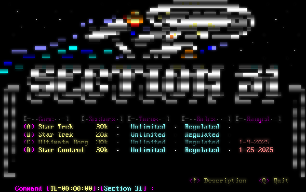Telnet connection detected. Please enter your name (ENTER for none): TradeWars Game Server Copyright (C) EIS TWGS v2.20b www.eisonline.com Server registered to POT Supports up to 25 games and 100 nodes · · · ▄▄▄▄█ ■ ■ ■█▀▀▀██▄▄▄▄ · · · · · · ▄▄ ▄██▀▀▄▄▄▄▄▄ ▄▄ ▄▄▄ ▄▄▄▀▀▀▄▄ · · · ▄ ▄▄▀▄▄▀▀▄▄█ ▀█ ▀█▀██▀█▄████████▄█▀█▀█▄▀█ · · · ▀ ▄▄ ▄▄█▀▀▀█▄▀▀ ▄▄ ▀▀▄▄▀▀███■▀▀▀▀▀■▀▀▀▄███▀▄▀ · · ▄ ▄▄███▄▀▀▀ ▀ ▄▄▄▀██▀▄▄■▀ ▄▄▄▀▄█ ▄▄▄▄▄▄▄▀▀ · · ▄▄▀▀ ▀▀▀ ▀▀▄ ▀▄▄▄▀▀ █▄▀▄▄▄▄▄ ▄▄ · · ▄▄▄▄ ▀▀▀ ▄▄ ▀▀ ▄▄▄ ▄▄ ▀▀▄ ▄▄▄▄██▀▀ ▄▄▀ ▄ ▀▀ · · ▀▀▀ ▀▀ ▀▀▀ ▀▀ ■▀ ▀▀ ▀▀ ▀ ▀▀ ▀▀▀▀ · · ▀▀ ▄▄ ▄▄▄▄▄ ▄▄▄▄▄ ▄▄▄▄ ▄▄▄▄▄▄▄▄ ▄▄▄▄ ▄▄▄▄ ▄▄▄ ▄▄▄ · ▄▄▄▄▄▄ ▄▄ · ▀▀ ██▄▄▀▀ ██▄▄▀▀ ██▄ ██▄▀▀▄██▄▀▀▄▄██ ██▄ ██▄▄██▀▄██ ▄▄▄▄▄▄▀ ▀▀█ █ ▀▀▀▀████▀▀ ███ █ ▀ ███▀ ███ ███ ███ ███ ▀▀█ ▄▄▄▀██▀███ ▄███ █▀██████ ▄▄███ ██ ▒ ███ ▒ ███ ███ ███ ███▀███ ██ ███ ███ ███▄ █ █ █ ▀▀▀▀ █ ▀▀▀▀▀█ ▀▀▀▀ █ ▀▀▀▀ ▒ ▀▀▀▀█ ▀▀▀▀ ▀▀▀ █▀▀▀ █▀▀▀▀▀ ▀▀▀▀ █ █ █ ▀▀▀ ▀▀▀▀ ▀▀▀ ▀▀▀ ▀▀▀ ▀▀▀ ▀▀ ▀▀ ▀▀▀▀ ▀▀▀ ░ █ █ █ ▓ ▓ █ █ [-··Game··-] [·Sectors·] [-·Turns·-] [-··Rules··-] [-·Banged·-] █ █ █ █ (A) Star Trek 30k · Unlimited · Regulated · █ █ █ █ (B) Star Trek 20k · Unlimited · Regulated · █ █ █ █ (C) Ultimate Borg 30k · Unlimited · Regulated · 1-9-2025 █ █ █ ▓ (D) Star Control 30k · Unlimited · Regulated · 1-25-2025 █ █ █ ░ █ █ █ █ █ █▄▄ █ <!> Description <Q> Quit Command [TL=00:00:00]:[Section 31] :