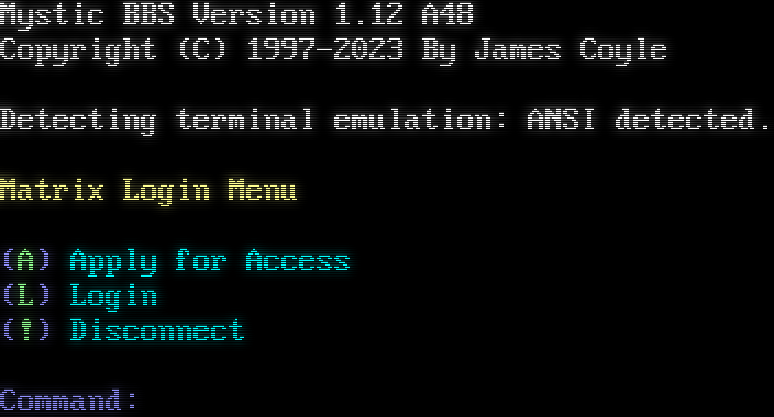 Mystic BBS Version 1.12 A48 Copyright (C) 1997-2023 By James Coyle Detecting terminal emulation: ANSI detected. Matrix Login Menu (A) Apply for Access (L) Login (!) Disconnect Command: