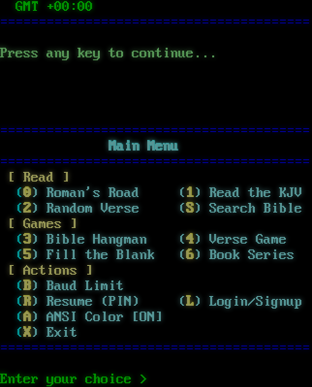 Press the BACKSPACE key to detect your terminal type: Terminal detected! Use ANSI color? (Y/N) [Y] > \*\* \*\* \*\* \*\* \*\* \*\*\*\*\*\*\*\*\*\*\*\* \*\* \*\*\*\*\*\* \*\* \*\*\*\*\*\* \*\* \*\* \*\* \*\* \*\* \*\* \*\* \*\* \*\* =​======================================= -= TelnetBible.com =- King James Bible Server Serving the Word Since 2025 SysOp: Ricky Bryce Version 1.4.7 Saturday, February 14, 2026, 18:19 GMT +00:00 =​======================================= Press any key to continue... =​======================================= Main Menu =​======================================= [ Read ] (0) Roman's Road (1) Read the KJV (2) Random Verse (S) Search Bible [ Games ] (3) Bible Hangman (4) Verse Game (5) Fill the Blank (6) Book Series [ Actions ] (B) Baud Limit (R) Resume (PIN) (L) Login/Signup (A) ANSI Color [ON] (X) Exit =​======================================= Enter your choice >