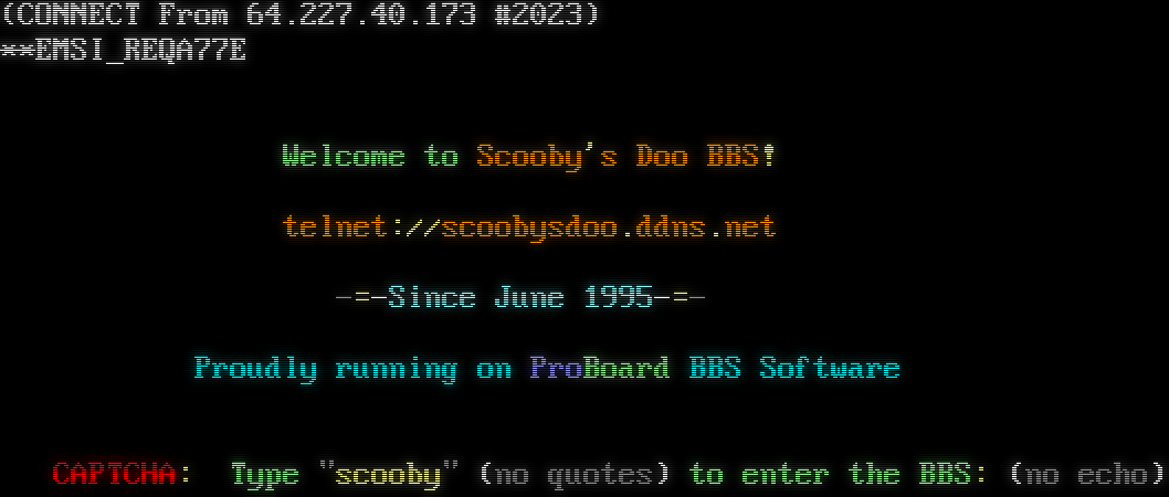 (CONNECT From 64.227.40.173 #2023) \*\*EMSI_REQA77E \*\*EMSI_REQA77E Welcome to Scooby's Doo BBS! telnet://scoobysdoo.ddns.net -=-Since June 1995-=- Proudly running on ProBoard BBS Software CAPTCHA: Type "scooby" (no quotes) to enter the BBS: (no echo)