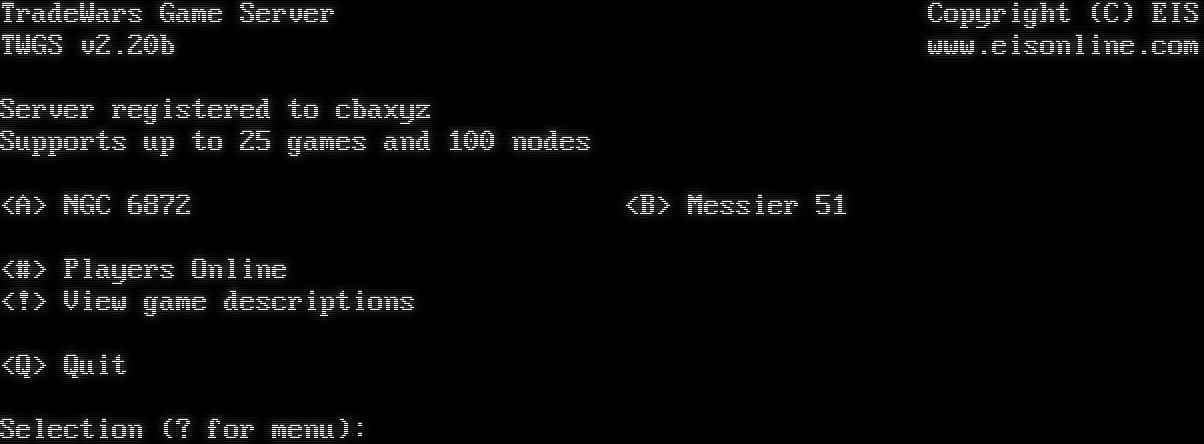 Telnet connection detected. Please enter your name (ENTER for none): TradeWars Game Server Copyright (C) EIS TWGS v2.20b www.eisonline.com Server registered to cbaxyz Supports up to 25 games and 100 nodes <A> NGC 6872 <B> Messier 51 <#> Players Online <!> View game descriptions <Q> Quit Selection (? for menu):