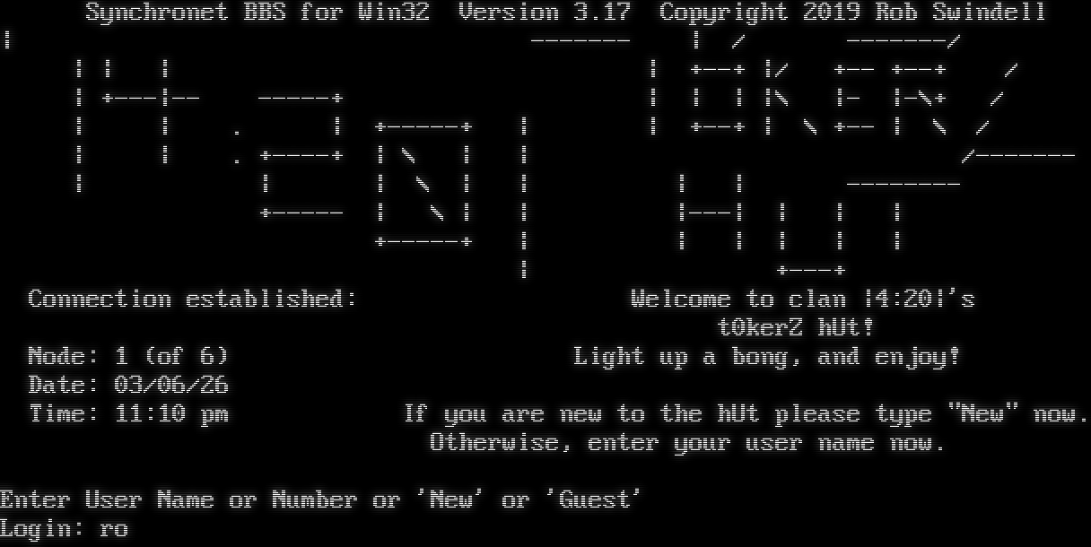 Synchronet BBS for Win32 Version 3.17 Telnet connection from: 64.227.40.173 Resolving hostname... __ Synchronet BBS for Win32 Version 3.17 Copyright 2019 Rob Swindell \| -​------ \| / -​------/ \| \| \| \| +​--+ \|/ +-- +​--+ / \| +​---\|-- -​----+ \| \| \| \|\\ \|- \|-\\+ / \| \| . \| +​-----+ \| \| +​--+ \| \\ +-- \| \\ / \| \| . +​----+ \| \\ \| \| /-​------ \| \| \| \\ \| \| \| \| -​------- +​----- \| \\ \| \| \|---\| \| \| \| +​-----+ \| \| \| \| \| \| \| +​---+ Connection established: Welcome to clan \|4:20\|'s t0kerZ hUt! Node: 1 (of 6) Light up a bong, and enjoy! Date: 03/06/26 Time: 11:10 pm If you are new to the hUt please type "New" now. Otherwise, enter your user name now. Enter User Name or Number or 'New' or 'Guest' Login: ro