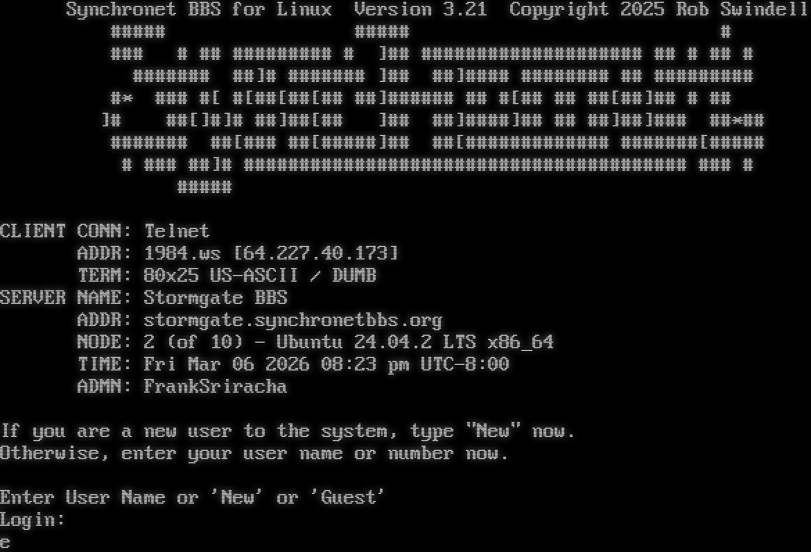Synchronet BBS for Linux Version 3.21 Telnet connection from: 64.227.40.173 Resolving hostname... _ _ Synchronet BBS for Linux Version 3.21 Copyright 2025 Rob Swindell #​#### #​#### # ### # ## #​######## # ]## #​################### ## # ## # #​###### ##]# #​###### ]## ##]#​### #​####### ## #​######## #\* ### #[ #[##[##[## ##]#​##### ## #[## ## ##[##]## # ## ]# ##[]#]# ##]##[## ]## ##]#​###]## ## ##]##]### ##\*## #​###### ##[### ##[#​####]## ##[#​############ #​######[#​#### # ### ##]# #​####################################### ### # #​#### CLIENT CONN: Telnet ADDR: 1984.ws [64.227.40.173] TERM: 80x25 US-ASCII / DUMB SERVER NAME: Stormgate BBS ADDR: stormgate.synchronetbbs.org NODE: 2 (of 10) - Ubuntu 24.04.2 LTS x86_64 TIME: Fri Mar 06 2026 08:23 pm UTC-8:00 ADMN: FrankSriracha If you are a new user to the system, type "New" now. Otherwise, enter your user name or number now. Enter User Name or 'New' or 'Guest' Login: Bee