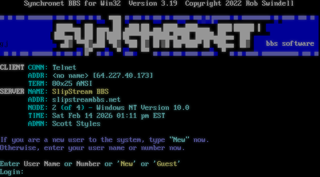 Synchronet BBS for Win32 Version 3.19 Telnet connection from: 64.227.40.173 Resolving hostname... _ _ Synchronet BBS for Win32 Version 3.19 Copyright 2022 Rob Swindell ▀█▀█▀▀█▀▀▀▀▀▀▀▀▀▀▀▀▀▀▀▀▀▀▄ ▀▒█ ▀▀▀▀▀▀▀▀▀▀▀▀▀▀▀▀▀▀▀░▀▐▀▀▀▀▀▀▀▀▀▀▀▀▀▀▀▀▀▀▀▀█▀▀█▀█ █████████████ ▒██▄▄▄ ▒█ ▄▄▄ ██ ▄█░▌▒█ ▄▄▐██▄▄▄▒██▄▄▄ ▒█░▌▒███▒ ▌ █████████████ ████████████▌▐██▄▄▐░ ██ ██▐███▐▀▀▀▀██▀████▄█▀██ ▐███▄▄██▄▄ ▐██ ▄▄▄▄████████████ gj███████████▄ ▄█▒ ▀▀█▒▄█▒ ▀▀▒ ▀█░ █▒ ▒▌▒█ ██▀██▀▀▐█ ▀██▄▄ ▐█▒ ███bbs software█ █▄█▄█▄▄█▄▄▄▄▄▄▄▄▄▄▄▄▌▒▀ ▄▄▄▄ ▀▐▄▄▄ ▀▀ ▄▄▄▄▄▄▄▄▄▄▄▄▄▄▄▄ ▀ ▄▄▄▄▄▄▄█▄▄▄▄▄▄▄▄▄█▄▄█▄ CLIENT CONN: Telnet ADDR: <no name> [64.227.40.173] TERM: 80x25 ANSI SERVER NAME: SlipStream BBS ADDR: slipstreambbs.net NODE: 2 (of 4) - Windows NT Version 10.0 TIME: Sat Feb 14 2026 01:11 pm EST ADMN: Scott Styles If you are a new user to the system, type "New" now. Otherwise, enter your user name or number now. Enter User Name or Number or 'New' or 'Guest' Login: