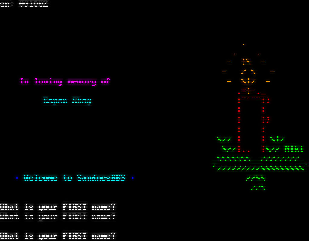 telnetd.device: Waiting for unit to answer. telnetd.device: Connected to TCP/IP port 24 unit 1.  ABBS 3.1 Node #6 38400:8N1 sn: 001002 . . . - \|\\ - - / \\ - In loving memory of - \\\|/ - .=\|-._ Espen Skog \|~'~~\|) \| \| \| \|) \| \| \\// \| \| \\\|/ \\//\|.. \|\\// Niki _\\\\\\\\\\\\\\__////////_ '/////////\\\\\\\\\\\\\\\\\\\` + Welcome to SandnesBBS + //\\\\ //\\ What is your FIRST name? What is your FIRST name? What is your FIRST name?
