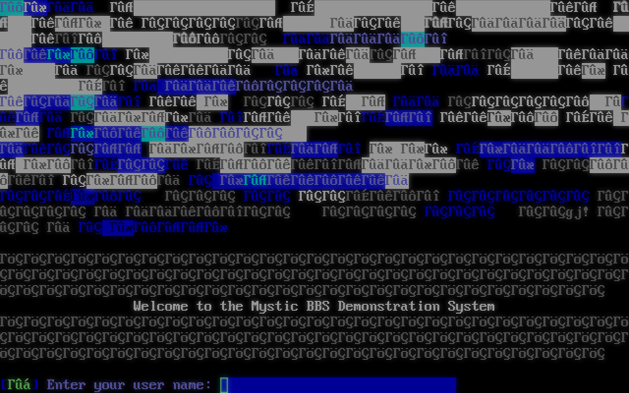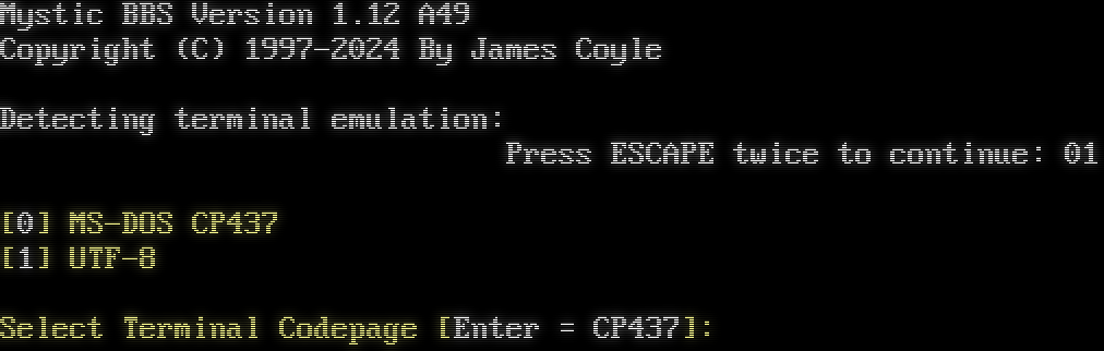 Mystic BBS Version 1.12 A49 Copyright (C) 1997-2024 By James Coyle Detecting terminal emulation:  Press ESCAPE twice to continue: 15151413121110090807060504030201 [0] MS-DOS CP437 [1] UTF-8 Select Terminal Codepage [Enter = CP437]: