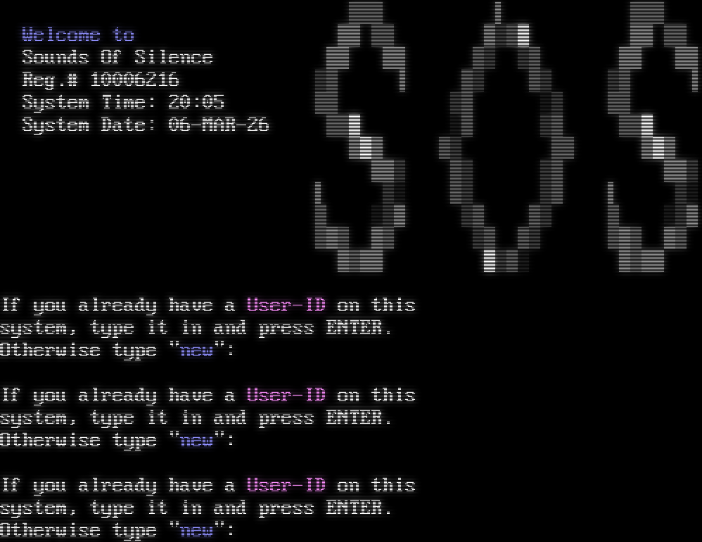 Auto-sensing...  ! ▓▓▓  ▌ ▓▓▓ Welcome to ██ ▓▓ █▒▓█ ██ ▓▓ Sounds Of Silence ██ ██ ▓▒ ▒▓ ██ ██ Reg.# 10006216 ▒▓ ▐ ▓▒ ▓▒ ▒▓ ▐ System Time: 20:05 ▓▓ ▒▓ ░▒ ▓▓ System Date: 06-MAR-26 ▓▓█ ░▓ ▒▓ ▓▓█  ███ ▓▒ ▓▓ ███ ██▒ ▓▒ ▒▓ ██▒ ▌ ▒░ ▓▒ ▒▓ ▌ ▒░ ▓ ░▒█ ▒▓ ▓▒ ▓ ░▒█ ▓█▓ █▓ ▒▓ ▓▒ ▓█▓ █▓ █▓██ █▒▓░  █▓██ If you already have a User-ID on this system, type it in and press ENTER. Otherwise type "new": If you already have a User-ID on this system, type it in and press ENTER. Otherwise type "new": If you already have a User-ID on this system, type it in and press ENTER. Otherwise type "new":