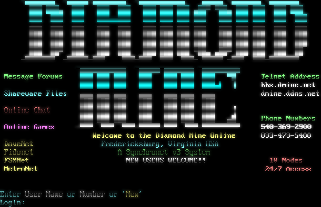 Synchronet BBS for Win32 Version 3.21 Telnet connection from: 64.227.40.173 Resolving hostname... _ ∩╗┐_ Synchronet BBS for Win32 Version 3.21 Copyright 2025 Rob Swindell CLIENT CONN: Telnet ADDR: 1984.ws [64.227.40.173] TERM: 80x25 ANSI SERVER NAME: Diamond Mine Online ADDR: dmine.net NODE: 1 (of 10) - Windows NT Version 11.0 (Build 26200) TIME: Fri Mar 06 2026 11:10 pm EST ADMN: Diamond Dave If you are a new user to the system, type "New" now. Otherwise, enter your user name or number now. ─▄▄▄▄▄▄▄ ─▄▄▄▄▄─▄▄▄▄▄▄▄▄ ─▄▄▄▄▄▄▄▄▄▄▄ ▄▄▄▄▄ ─▄▄▄▄▄▄▄ ─▄▄▄▄▄▄▄ ▓▓▓▓▓▓▄ ▒▒▒▒▒▒▒▒▒▒▒▒▒▒▒▒▒▒▄▓▓▀ ▀▓▓▄ ▒▒▒▒▒▒▓▓▓▓▓▓ ▒▒▒▒▒▒░░░░░░▄▄░░░░░░░░░░░░▒▒▒▒▒▒░░░░░░▒▒▒▒▒▒ ▄▄▄ ▄▄▄ ▄▄▄ ▄▄▄ ▄▄▄ ▄▄▄ ▄▄▄ ▄▄▄ ▄▄▄ ▄▄▄ ▄▄▄ ▄▄▄ ▄▄▄ ▄▄▄ █▓▒█▓▒█▓▒█▓▒█▓▒█▓▒█▓▒█▓▒█▓▒█▓▒█▓▒█▓▒█▓▒█▓▒ ▓▒░▓▒░▓▒░▓▒░▓▒░▓▒░▓▒░▓▒░▓▒░▓▒░▓▒░▓▒░▓▒░▓▒░ ▒░█ ▒░▀ ▒░ ▒░ ▒░ ▒░ ▒░ ▒░ ▀▒░▄ ▄░░▀ ▒░ ▒░ ▒░█ ▒░ ─▀▀▀▀▀▀▀ ─▀▀▀▀▀─▀▀▀ ▀▀▀─▀▀▀ ▀▀▀ ▀▀▀─ ▀▀▀▀▀ ─▀▀▀ ▀▀▀─▀▀▀▀▀▀▀ ─▄▄▄▄▄▄▄▄▄▄▄ ─▄▄▄▄▄─▄▄▄▄▄▄▄ ─▄▄▄▄▄▄▄▄▄ Message Forums ▒▒▒▒▒▒▒▒▒▒▒▒▒▒▒▒▒▒▒▒▒▀█Telnet Address ░░░░░░░░░░░░░░░░░░░░░▄▌ ▐bbs.dmine.net Shareware Files ▄▄▄ ▄▄▄ ▄▄▄ ▄▄▄ ▄▄▄ ▄▄▄ ▄▄▄dmine.ddns.net █▓▒█▓▒█▓▒█▓▒█▓▒█▓▒█▓▒ Online Chat▓▒░▓▒░▓▒░▓▒░▓▒░▓▒░▓▒░▐ ▒░ ▒░ ▒░ ▒░ ▒░ ▒░ ▒░ ▄█Phone Numbers Online Games─▀▀▀ ▀▀▀ ▀▀▀─▀▀▀▀▀─▀▀▀ ▀▀▀─▀▀▀▀▀▀▀▀▀540-369-2900 Welcome to the Diamond Mine Online833-473-5400 DoveNetFredericksburg, Virginia USA FidonetA Synchronet v3 System FSXNetNEW USERS WELCOME!!10 Nodes MetroNet24/7 Access Enter User Name or Number or 'New' Login: