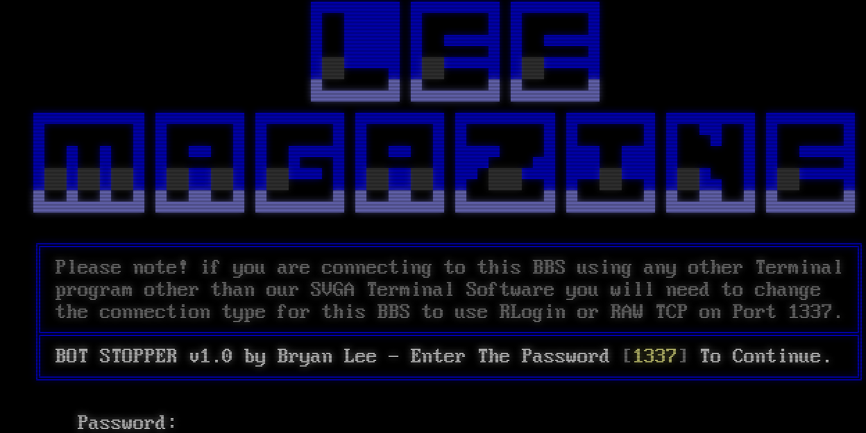 Mystic BBS Version 1.12 A49 Copyright (C) 1997-2024 By James Coyle Welcome!! Please wait while the system is loading... ▄▄▄▄▄▄▄▄▄▄▄▄▄▄▄▄▄▄▄▄▄▄▄▄█████████████████▀▀▀▀██▀▀▀▀██▒▒▀▀▀▀██▒▒▀▀▀▀██ ▒▒▀▀▀▀██▄▄▄▄▄▄██▄▄▄▄▄▄██▄▄▄▄▄▄█▄▄▄▄▄▄▄▄▄▄▄▄▄▄▄▄▄▄▄▄▄▄▄▄▄▄▄▄▄▄▄▄▄▄▄▄▄▄▄▄▄▄▄▄▄▄▄▄▄▄▄▄▄▄▄▄▄▄▄▄▄▄▄▄▄▄▄██████ ███████▀█████████▀▀███▀▀▀██▀▀████▄▀██████████▀▀▀▀██ ▒▒█▒▒█▒▒██▒▒██▒▒██▒▒▀▀▀██▒▒██▒▒██▄▒▒▒▀ ▄██▀▀▒▒▀▀██▒▒█▄██▒▒▀▀▀▀██▄▄█▄▄█▄▄██▄▄██▄▄██▄▄▄▄▄▄██▄▄██▄▄██▄▄▄▄▄▄▄██▄▄▄▄▄▄██▄▄██▄▄██▄▄▄▄▄▄█ ╔═════════════════════════════════════════════════════════════════════════╗║Pleasenote!ifyouareconnectingtothisBBSusinganyotherTer minal║║programotherthanourSVGATerminalSoftwareyouwillneedtochange║║theconnectiontypeforthis BBStouseRLoginorRAWTCPonPort1337.║╠═════════════════════════════════════════════════════════════════════════╣║BOTSTOPPERv1.0 byBryanLee-EnterThePassword[1337]ToContinue.║╚═════════════════════════════════════════════════════════════════════════╝ Password: