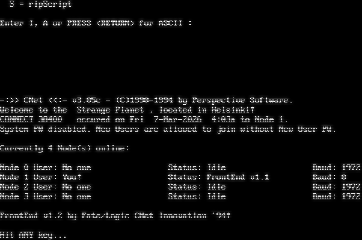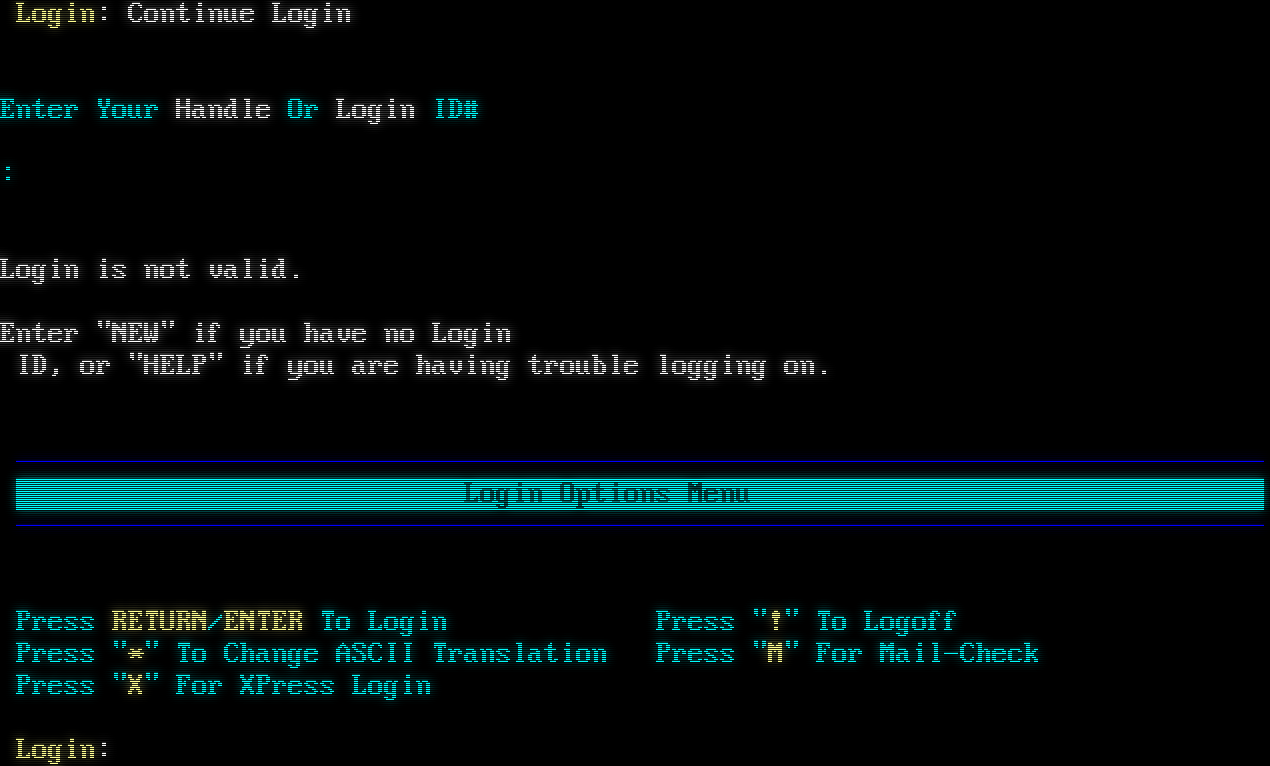 tcpser device: waiting for the bbs to answer tcpser device: connected to port 6400 unit 1 tcpser device: give us a few seconds to answer tcpser device: your callATA  IMAGE BBS V3.X (C) 2023 S# I0971 CONNECTION CONFIRMED: 38400 ANSI/Graphics Detected Are You in 80 Columns?: [Yes]      Yes ────────────────────────────────────────────────────────────────────────────── Image BBS v3.0 (c) 2020 NISSA ────────────────────────────────────────────────────────────────────────────── Welcome to 16. It is now Fri Mar 6, 2026 10:12 PM. The last caller was NetMail From WN5. ────────────────────────────────────────────────────────────────────────────── Login Options Menu ────────────────────────────────────────────────────────────────────────────── Press RETURN/ENTER To Login Press "!" To Logoff Press "\*" To Change ASCII Translation Press "M" For Mail-Check Press "X" For XPress Login Login: Continue Login Enter Your Handle Or Login ID# : Login is not valid. Enter "NEW" if you have no Login ID, or "HELP" if you are having trouble logging on. ────────────────────────────────────────────────────────────────────────────── Login Options Menu ────────────────────────────────────────────────────────────────────────────── Press RETURN/ENTER To Login Press "!" To Logoff Press "\*" To Change ASCII Translation Press "M" For Mail-Check Press "X" For XPress Login Login: Continue Login Enter Your Handle Or Login ID# : Login is not valid. Enter "NEW" if you have no Login ID, or "HELP" if you are having trouble logging on. ────────────────────────────────────────────────────────────────────────────── Login Options Menu ────────────────────────────────────────────────────────────────────────────── Press RETURN/ENTER To Login Press "!" To Logoff Press "\*" To Change ASCII Translation Press "M" For Mail-Check Press "X" For XPress Login Login: