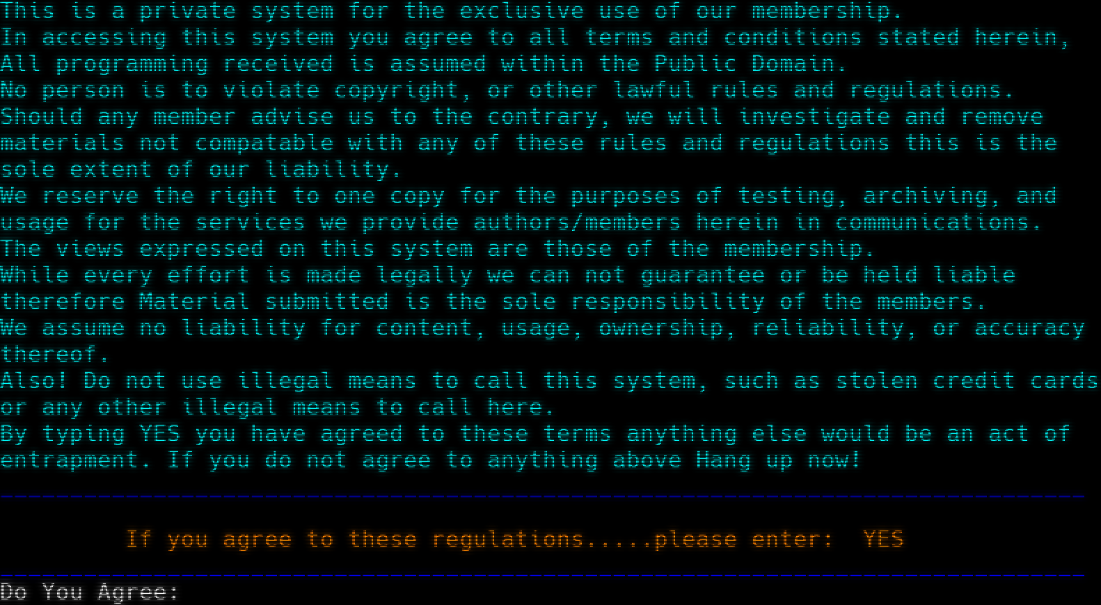 /X Native Telnet: Searching for free node... /X Native Telnet: Successful connection to node 1 CONNECT 19200 \*\*EMSI_IRQ8E08 Welcome to CEMENT CITY, located in THE CENTRE OF THE KINGDOM Running AmiExpress 5.6.2-dev Copyright 2018-2023 Darren Coles Registration NONE. You are connected to Node 1 at 19200 baud Connection occured at Sat 07-Mar-2026 04:16:09. ANSI, RIP or No graphics (A/r/n)? 09 This is a private system for the exclusive use of our membership. In accessing this system you agree to all terms and conditions stated herein, All programming received is assumed within the Public Domain. No person is to violate copyright, or other lawful rules and regulations. Should any member advise us to the contrary, we will investigate and remove materials not compatable with any of these rules and regulations this is the sole extent of our liability. We reserve the right to one copy for the purposes of testing, archiving, and usage for the services we provide authors/members herein in communications. The views expressed on this system are those of the membership. While every effort is made legally we can not guarantee or be held liable therefore Material submitted is the sole responsibility of the members. We assume no liability for content, usage, ownership, reliability, or accuracy thereof. Also! Do not use illegal means to call this system, such as stolen credit cards or any other illegal means to call here. By typing YES you have agreed to these terms anything else would be an act of entrapment. If you do not agree to anything above Hang up now! _​_____________________________________________________________________________ If you agree to these regulations.​....please enter: YES _​_____________________________________________________________________________ Do You Agree: Invalid PassWord This is a private system for the exclusive use of our membership. In accessing this system you agree to all terms and conditions stated herein, All programming received is assumed within the Public Domain. No person is to violate copyright, or other lawful rules and regulations. Should any member advise us to the contrary, we will investigate and remove materials not compatable with any of these rules and regulations this is the sole extent of our liability. We reserve the right to one copy for the purposes of testing, archiving, and usage for the services we provide authors/members herein in communications. The views expressed on this system are those of the membership. While every effort is made legally we can not guarantee or be held liable therefore Material submitted is the sole responsibility of the members. We assume no liability for content, usage, ownership, reliability, or accuracy thereof. Also! Do not use illegal means to call this system, such as stolen credit cards or any other illegal means to call here. By typing YES you have agreed to these terms anything else would be an act of entrapment. If you do not agree to anything above Hang up now! _​_____________________________________________________________________________ If you agree to these regulations.​....please enter: YES _​_____________________________________________________________________________ Do You Agree: