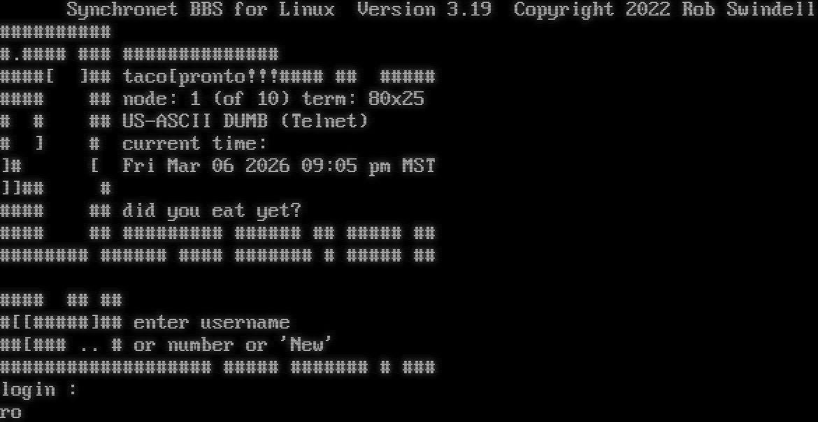 Synchronet BBS for Linux Version 3.19 Telnet connection from: 64.227.40.173 Resolving hostname... _ _ Synchronet BBS for Linux Version 3.19 Copyright 2022 Rob Swindell #​######### #​.#### ### #​############# #​###[ ]## taco[pronto!!!#​### ## #​#### #​### ## node: 1 (of 10) term: 80x25 # # ## US-ASCII DUMB (Telnet) # ] # current time: ]# [ Fri Mar 06 2026 09:05 pm MST ]]## # #​### ## did you eat yet? #​### ## #​######## #​##### ## #​#### ## #​####### #​##### #​### #​###### # #​#### ## #​### ## ## #[[#​####]## enter username ##[### .. # or number or 'New' #​################## #​#### #​###### # ### login : ro