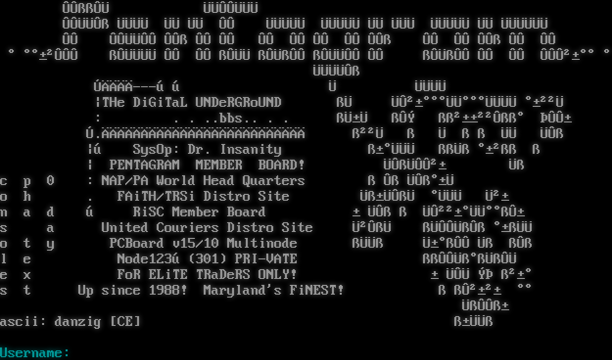 DayDream BBS/UNiX 2.15a Programming by Antti Häyrynen 1996, 1997, DayDream Development Team 1998, 1999, 2000, 2001, 2002, 2003, 2004, Bo Simonsen 2008, 2009, 2010 Currently maintained by Ryan Fantus You are connected to node #1 at 57600 BPS. ÛÛßßÛÜ ÜÜÛÛÜÜÜ ÛÛÜÜÛß ÜÜÜÜ ÜÜ ÜÜ ÛÛ ÜÜÜÜÜ ÜÜÜÜÜ ÜÜ ÜÜÜ ÜÜÜÜÜ ÜÜ ÜÜÜÜÜÜ ÛÛ ÛÛÜÜÛÛ ÛÛß ÛÛ ÛÛ ÛÛ ÛÛ ÛÛ ÛÛ ÛÛß ÛÛ ÛÛ ÛÛß ÛÛ ÛÛ ° °°±²ÛÛÛ ßÛÜÜÜÜ ÛÛ ÛÛ ßÛÜÜ ßÛÜßÛÛ ßÛÜÜÛÛ ÛÛ ßÛÜßÛÛ ÛÛ ÛÛ ÛÛÛ²±°° ° ÜÜÜÜÛß ÚÄÄÄÄ---ú ú Ü ÜÜÜÜ \|THe DiGiTaL UNDeRGRoUND ßÜ ÜÛ²±°°°Üܰ°°ÜÜÜÜ °±²²Ü : . . ..bbs.. . . ßÜ±Ü ßÛÝ ßß²±±²²Ûßß° ÞÛÛ± Ú.ÄÄÄÄÄÄÄÄÄÄÄÄÄÄÄÄÄÄÄÄÄÄÄÄÄÄ ß²²Ü ß Ü ß ß ÜÜ ÜÛß \|ú SysOp: Dr. Insanity ß±°ÜÜÜ ßßÜß °±²ßß ß \| PENTAGRAM MEMBER BOARD! ÜÛßÜÛÛ²± Üß c p 0 : NAP/PA World Head Quarters ß Ûß ÜÛß°±Ü o h . FAiTH/TRSi Distro Site Üß±ÜÛßÜ °ÜÜÜ Ü²± n a d ú RiSC Member Board ± ÜÛß ß ÜÛ²²±°Üܰ°ßÛ± s a United Couriers Distro Site ܲÛßÜ ßÜÛÛÜßÛß °±ßÜÜ o t y PCBoard v15/10 Multinode ßÜÜß Ü±°ßÛÛ Üß ßÛß l e Node123ú (301) PRI-VATE ßßÛÛÜß°ßÜßÛÜ e x FoR ELiTE TRaDeRS ONLY! ± ÜÛÜ ÝÞ ß²±° s t Up since 1988! Maryland's FiNEST! ß ßÛ²±²± °° ÜßÛÛß± ascii: danzig [­CE] ß±ÜÜß Username:
