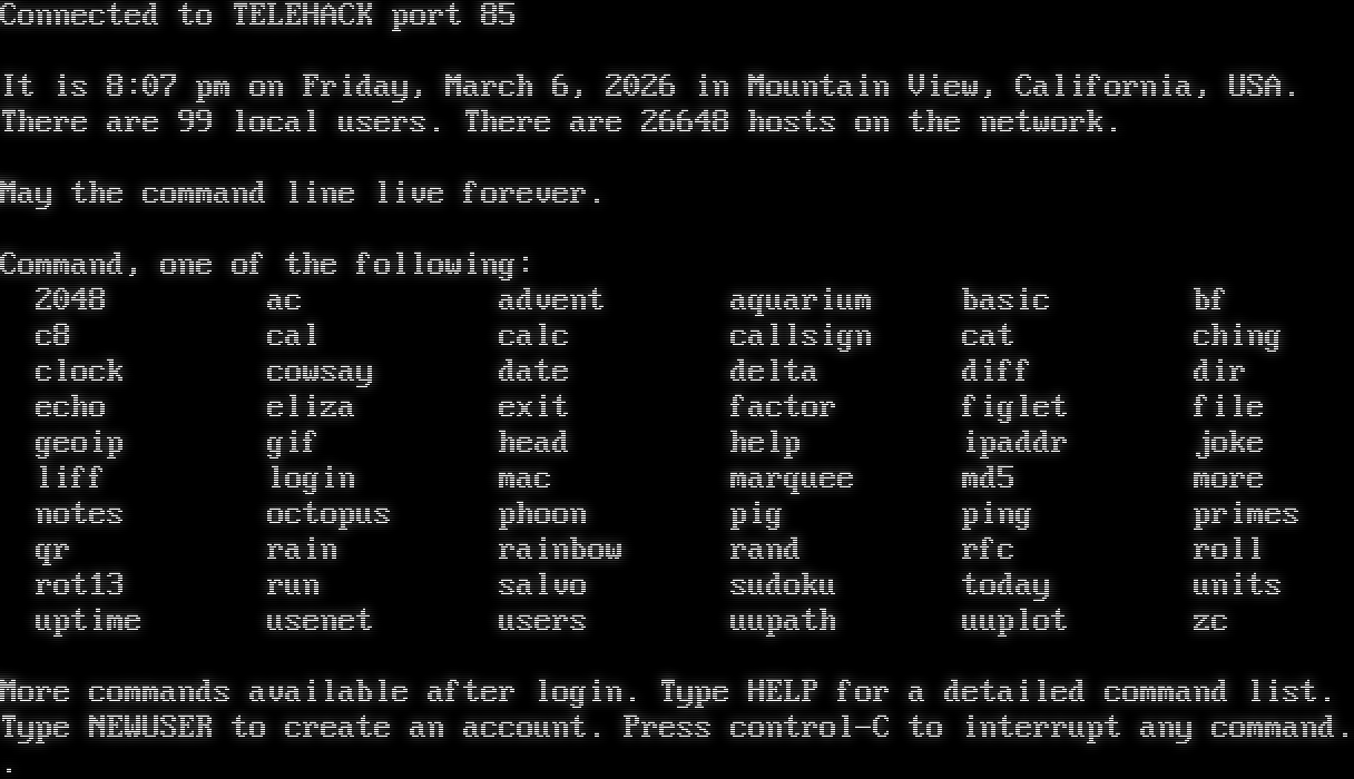Connected to TELEHACK port 85 It is 8:07 pm on Friday, March 6, 2026 in Mountain View, California, USA. There are 99 local users. There are 26648 hosts on the network. May the command line live forever. Command, one of the following: 2048 ac advent aquarium basic bf c8 cal calc callsign cat ching clock cowsay date delta diff dir echo eliza exit factor figlet file geoip gif head help ipaddr joke liff login mac marquee md5 more notes octopus phoon pig ping primes qr rain rainbow rand rfc roll rot13 run salvo sudoku today units uptime usenet users uupath uuplot zc More commands available after login. Type HELP for a detailed command list. Type NEWUSER to create an account. Press control-C to interrupt any command. .