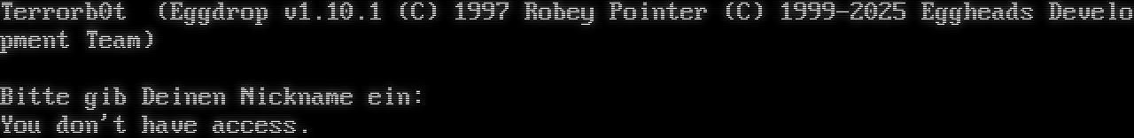Terrorb0t (Eggdrop v1.10.1 (C) 1997 Robey Pointer (C) 1999-2025 Eggheads Development Team) Bitte gib Deinen Nickname ein: You don't have access.