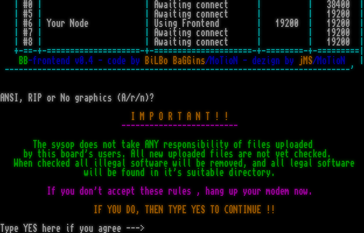 telnetd.device: Waiting for unit to answer. telnetd.device: Connected to TCP/IP port 2020 unit 0.  CONNECT 19200 \*\*EMSI_IRQ8E08 Welcome to NORTHERN PALACE, located in TRiSTAR & ReD SeCTOR iNC. Running AmiExpress 5.5.0-dev Copyright 2018-2021 Darren Coles Original Version (C)1992-95 LightSpeed Technologies Inc. Registration TNP!. You are connected to Node 6 at 19200 baud Connection occured at Sat 07-Mar-2026 05:12:12. : : : : : ^​-==-+-====================-+-=====================-+-========-+-=========+- \| Nd \| Name/Handle \| Action \| Baud \| Init \| \|=​==-+-===^-----------^====-+-======^------^=======-+-=^----^=-+-=^----^==\| \| #0 \| \| Awaiting connect \| \| 38400 \| \| #5 \| \| Awaiting connect \| \| 19200 \| \| #6 \| Your Node \| Using Frontend \| 19200 \| 19200 \| \| #7 \| \| Awaiting connect \| \| 19200 \| \| #8 \| \| Awaiting connect \| \| 19200 \| +​-==-+-====================-+-=====================-+-========-+-=========\| BB-frontend v0.4 - code by BiLBo BaGGins/MoTioN - dezign by jMS/MoTioN \| -​-------------------------------------------------------------------------' ANSI, RIP or No graphics (A/r/n)? I M P O R T A N T ! ! -​------------------------ The sysop does not take ANY responsibility of files uploaded by this board's users. All new uploaded files are not yet checked. When checked all illegal software will be removed, and all legal software will be found in it's suitable directory. If you don't accept these rules , hang up your modem now. IF YOU DO, THEN TYPE YES TO CONTINUE !! Type YES here if you agree --->