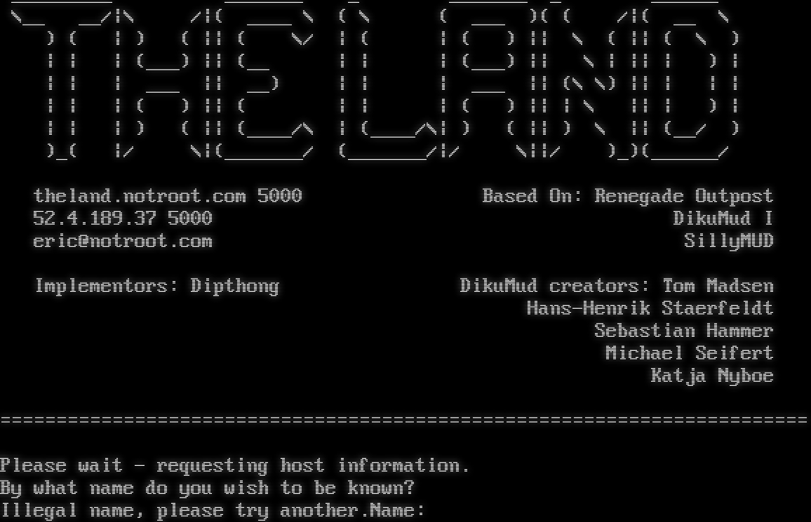 =​======================================================================= _​________ _​______ _ _​______ _ _​_____ \\__ __/\|\\ /\|( _​___ \\ ( \\ ( ___ )( ( /\|( __ \\ ) ( \| ) ( \|\| ( \\/ \| ( \| ( ) \|\| \\ ( \|\| ( \\ ) \| \| \| (___) \|\| (__ \| \| \| (___) \|\| \\ \| \|\| \| ) \| \| \| \| ___ \|\| __) \| \| \| ___ \|\| (\\ \\) \|\| \| \| \| \| \| \| ( ) \|\| ( \| \| \| ( ) \|\| \| \\ \|\| \| ) \| \| \| \| ) ( \|\| (_​___/\\ \| (_​___/\\\| ) ( \|\| ) \\ \|\| (__/ ) )_( \|/ \\\|(_​______/ (_​______/\|/ \\\|\|/ )_)(_​_____/ theland.notroot.com 5000 Based On: Renegade Outpost 52.4.189.37 5000 DikuMud I eric@notroot.com SillyMUD Implementors: Dipthong DikuMud creators: Tom Madsen Hans-Henrik Staerfeldt Sebastian Hammer Michael Seifert Katja Nyboe =​======================================================================= Please wait - requesting host information. By what name do you wish to be known? Illegal name, please try another.Name: