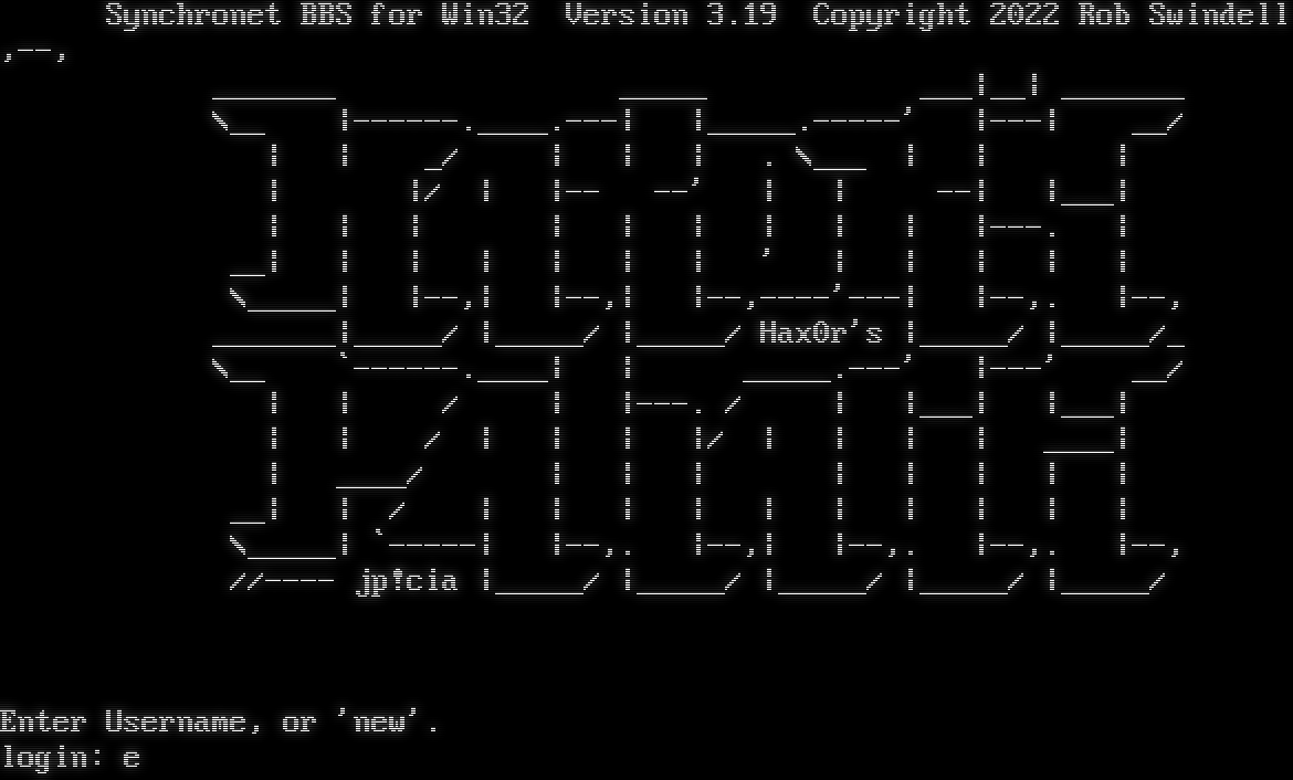 Synchronet BBS for Linux Version 3.21 Telnet connection from: 64.227.40.173 Resolving hostname... _ _ Synchronet BBS for Linux Version 3.21 Copyright 2025 Rob Swindell +​-----+ +- -+ +​--+ -+ +​-----+ +- -+ +​-----+ +​-----+ +​--+ -+ +​-----+ +​-----+ +​-----+ +​-----+ \|\| \| \|\| \|\| \|+​---+\| \|\|-​---+ \|\| \|\| \|\| \| \|\| \|+-- \|\|\| +​-----+ +-+ +- +​--+ +​-----+ +- -+ +- +-+ +​-----+ +- +​--+ +​-----+ --- CLIENT CONN: Telnet ADDR: 1984.ws [64.227.40.173] TERM: 80x25 US-ASCII / DUMB SERVER NAME: Steven's Hive BBS ADDR: stevensbbs.stevenshive.xyz NODE: 1 (of 10) - Ubuntu 24.04.2 LTS x86_64 TIME: Fri Mar 06 2026 08:18 pm UTC-8:00 ADMN: StevenTheBee If you are a new user to the system, type "New" now. Otherwise, enter your user name or number now. NN: Enter User Name or 'New' or 'Guest' Login: Bee