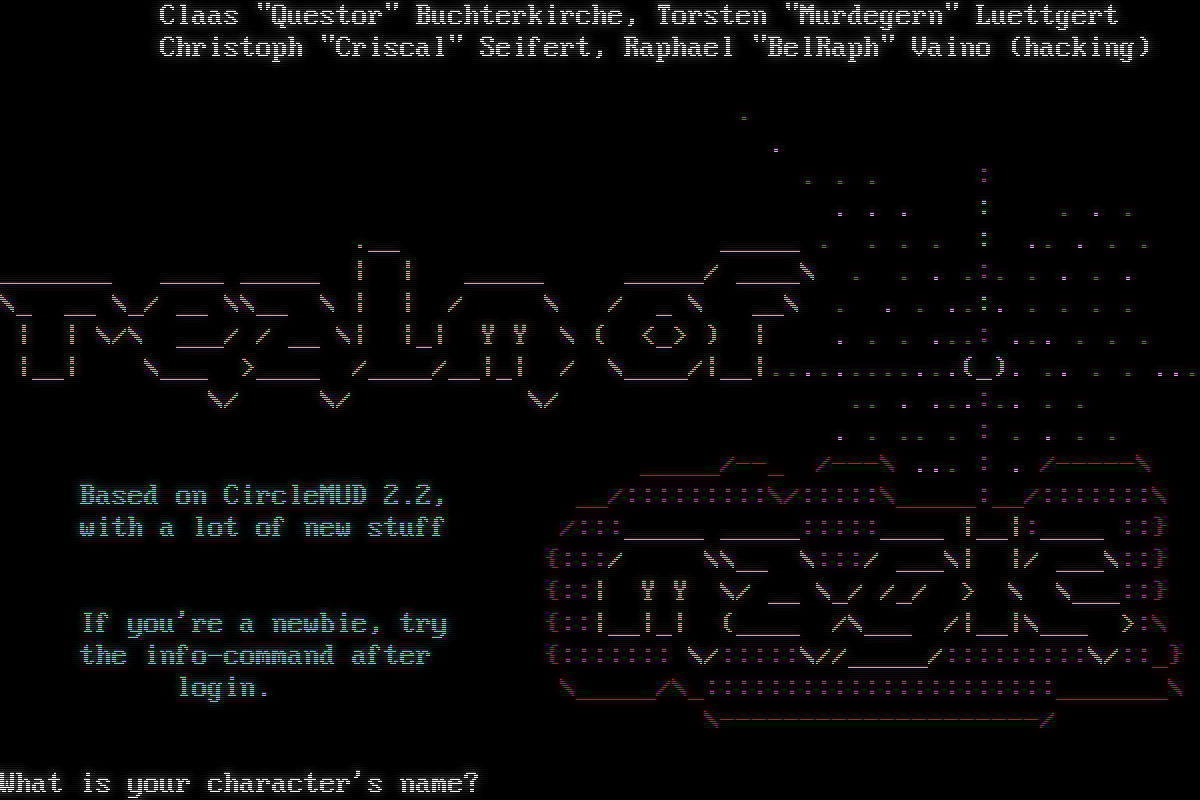 Connect to port 4001 if you want no color. Connect to port 4002 if you are visually impaired. Welcome to the Realm of Magic Created by Claas "Questor" Buchterkirche, Wolfram "Karl" Schroeder, Stefan "Bhao" Wichmann and Jani Fikouras Supported by Wolfgang "Highlander" Wiese (management) and, alphabetically, Claas "Questor" Buchterkirche, Torsten "Murdegern" Luettgert Christoph "Criscal" Seifert, Raphael "BelRaph" Vaino (hacking) . : . . . : . .-. . . : . : : . . .​--. .​--. .​--. : : .,-.,-.,-. . : ..'' '_.'' .; ; : :_ : ,. ,. : . :_; \`.​__.'\`.__,_;\`.__;:_;:_;:_; .​--. . : . . : .-' . . : . . .​--. : \`; . . : . . ' .; :: : . . : . . \`.​__.':_; . . : . . _ . . : . . :_; ..:.. ,-.,-.,-. .​--. .​--. .-. .​--. . . . . . . .o. . . . . . . . . .:.,..,..:'..;.;.'..;.::.:'.​...'. . . . . ..:.. :_;:_;:_;\`.__,_;\`._. ;:_;\`.​__.' . . : . . .-. : . . : . . \`._.' . . : . . . . : . . Based on a CircleMUD 2.2, with lots of . . : . . new things added. If you're a beginner, type 'info' once you're in the game. What is your character's name? Welcome to the Realm of Magic Created by Claas "Questor" Buchterkirche, Wolfram "Karl" Schroeder, Stefan "Bhao" Wichmann and Jani Fikouras Supported by Wolfgang "Highlander" Wiese (management) and, alphabetically, Claas "Questor" Buchterkirche, Torsten "Murdegern" Luettgert Christoph "Criscal" Seifert, Raphael "BelRaph" Vaino (hacking) . . . . . : . . . : . . . .__ _​____ . . . . : .. . . . _​______ _​___ _​____ \| \| _​____ _​____/ _​___\\ . . . .:. . . . . \\_ __ \\_/ __ \\\\__ \\ \| \| / \\ / _ \\ __\\ . . . ..:. . . . . \| \| \\/\\ ___/ / __ \\\| \|_\| Y Y \\ ( <_> ) \| . . . ...: ... . . . \|__\| \\___ >_​___ /_​___/__\|_\| / \\_​___/\|__\|.​...........(_). .. . . ... \\/ \\/ \\/ .. . ...:.. . . . . .. . : . . . . _​____/--_ /---\\ ... : . /-​----\\ Based on CircleMUD 2.2, __/:::::::::\\/:::::\\_​____:__/:::::::\\ with a lot of new stuff /:::_​____ _​____:::::_​___ \|__\|:_​___ ::} {:::/ \\\\__ \\:::/ ___\\\| \|/ ___\\::} {::\| Y Y \\/ __ \\_/ /_/ > \\ \\___::} If you're a newbie, try {::\|__\|_\| (_​___ /\\___ /\|__\|\\___ >:\\ the info-command after {::::::: \\/:::::\\//_​____/:::::::::\\/::_} login. \\_​____/\\_::::::::::::::::::::::_​______\\ \\-​-------------------/ What is your character's name?