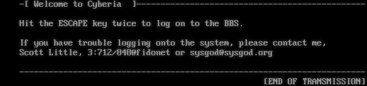 \*\*EMSI_REQA77E \*\*EMSI_REQA77E -PZT8AF6- -[ Welcome to Cyberia ]-​---------------------------------------------- Hit the ESCAPE key twice to log on to the BBS. If you have trouble logging onto the system, please contact me, Scott Little, 3:712/848@fidonet or sysgod@sysgod.org -​---------------------------------------------------------------------- [END OF TRANSMISSION]